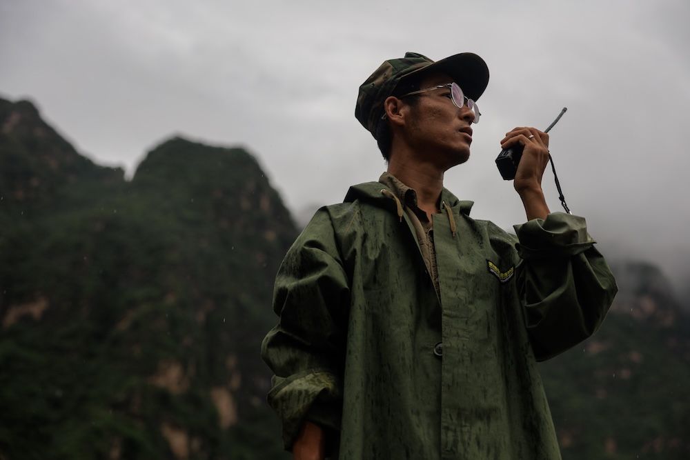 2025年8月21日,十八渡,巡护队员在山区使用对讲机汇报情况。