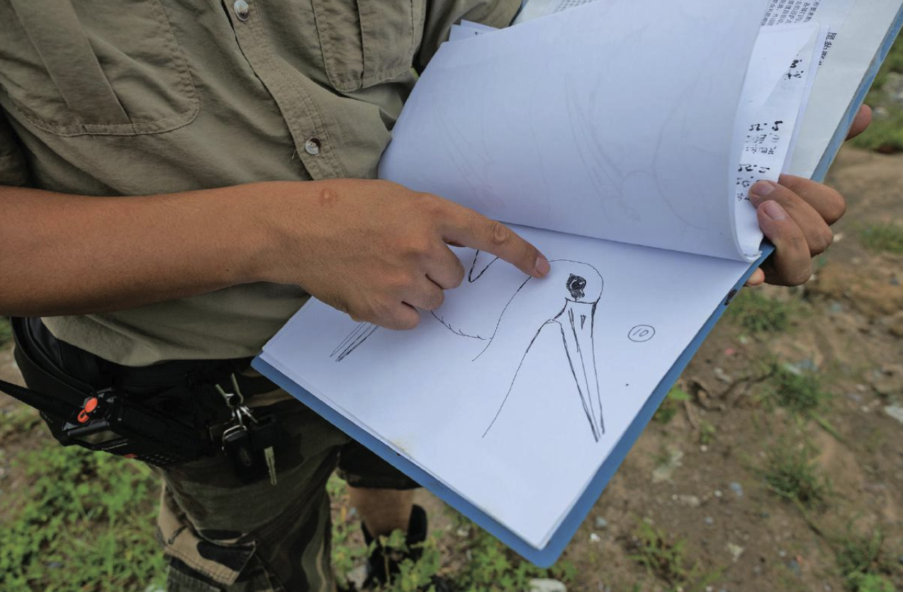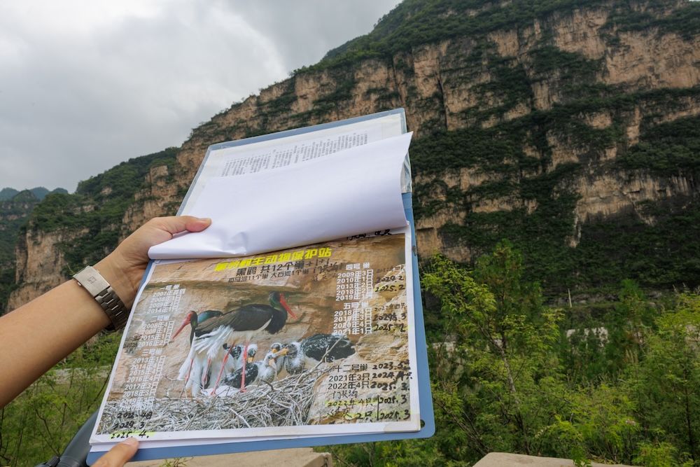 2025年8月21日,十渡,巡护员正在对比记录,讨论刚刚观测到的黑鹳“它是谁”。