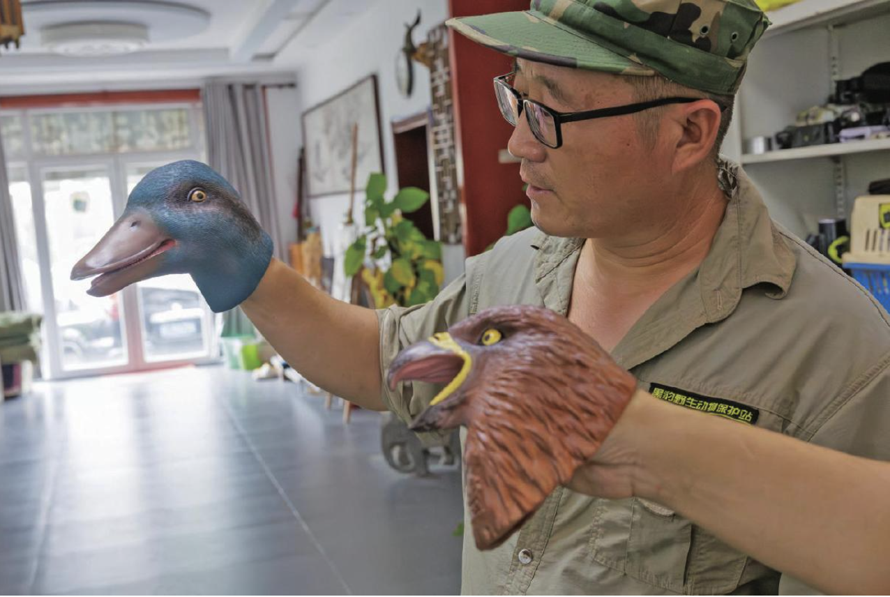 李理是黑豹野生动物保护站的站长,巡护前准备着最重要的几样东西,对讲机、高倍望远镜、动物声音搜索器、记录册等。大喇叭模样的搜索器朝向远处,巡护员们分辨着耳机里传来的各种声音。“黑鹳幼鸟的声音有明显特征,依靠它们的叫声可以分辨黑鹳大概方向。”李理从事黑鹳保护工作25年,黑鹳的各种姿态、声音,已经刻录在他的脑海中。