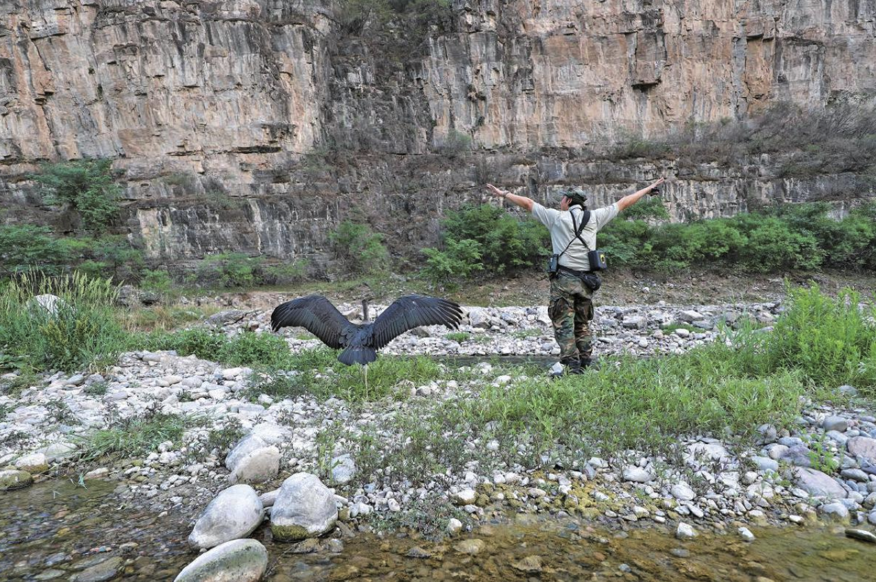 2022年6月,拒马河畔,巡护队员救助的黑鹳“鹳鹳”康复,李理带它在户外学飞、捕食,为回归自然做准备。 受访者供图