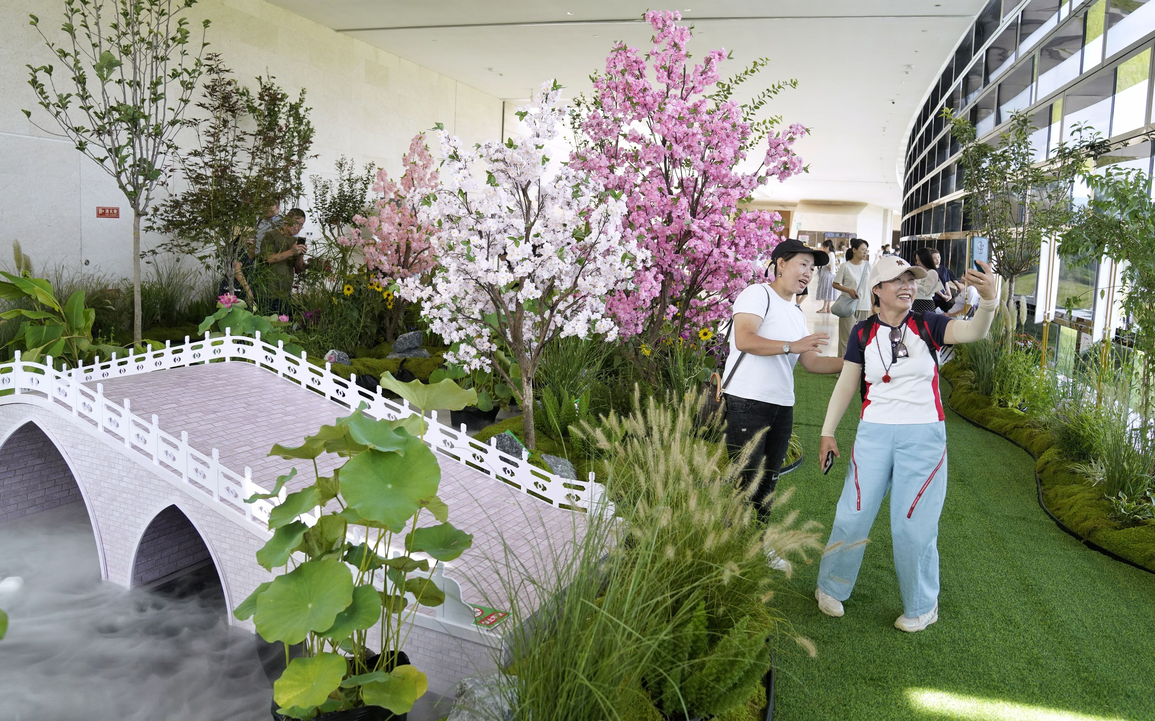 在展厅中央,一座按比例微缩的玉渊潭公园实景尤为引人注目。芦苇、鸳鸯等生态元素栩栩如生,中堤桥横跨东西两湖,公园IP形象“小樱”吸引游客打卡合照。公园标志性的紫藤廊架下为拍照打卡区,一旁的电子屏滚动播放玉渊潭公园四季生态视频,展现公园春樱、夏荷、秋叶、冬雪的四季流转之美。