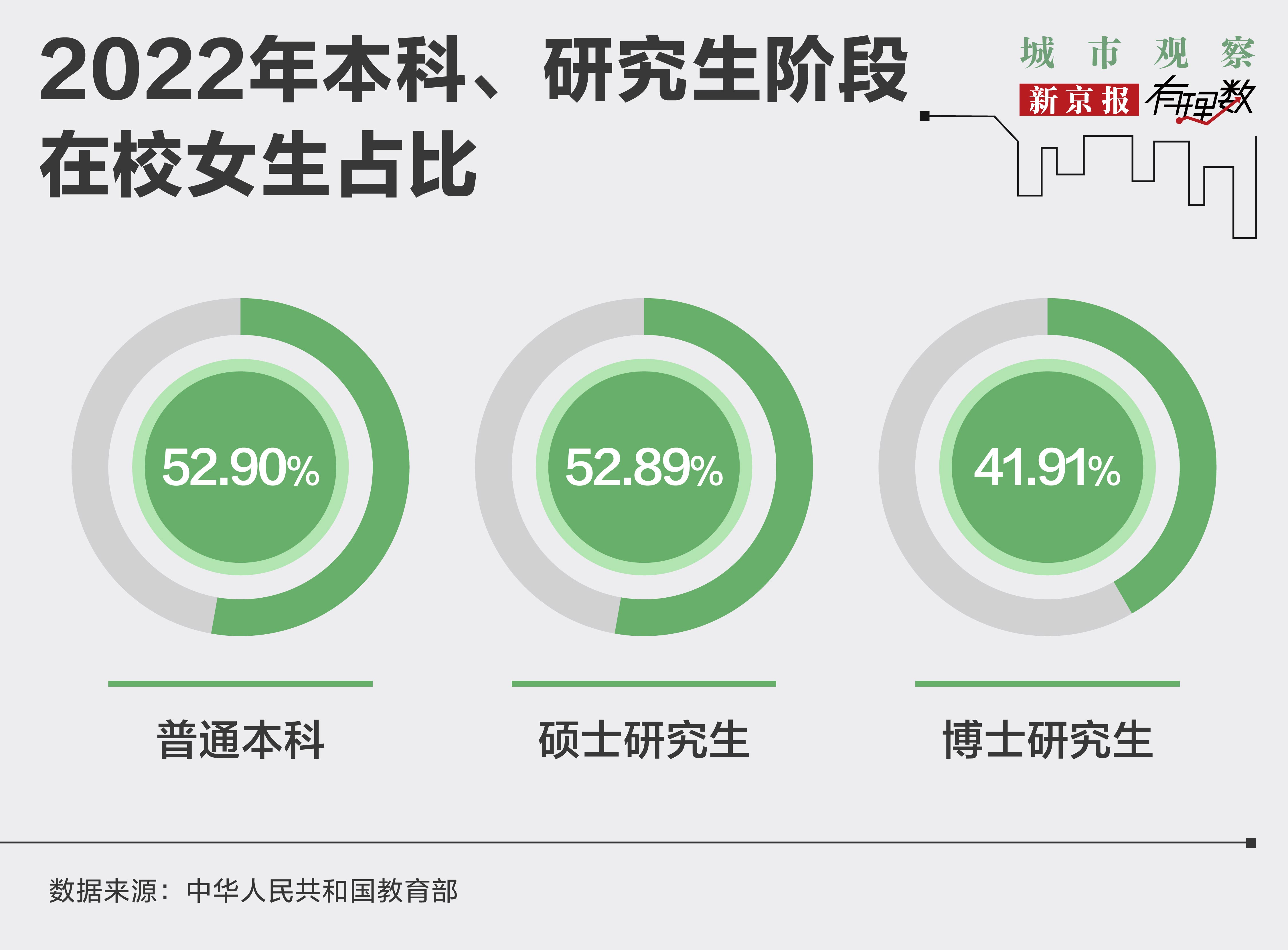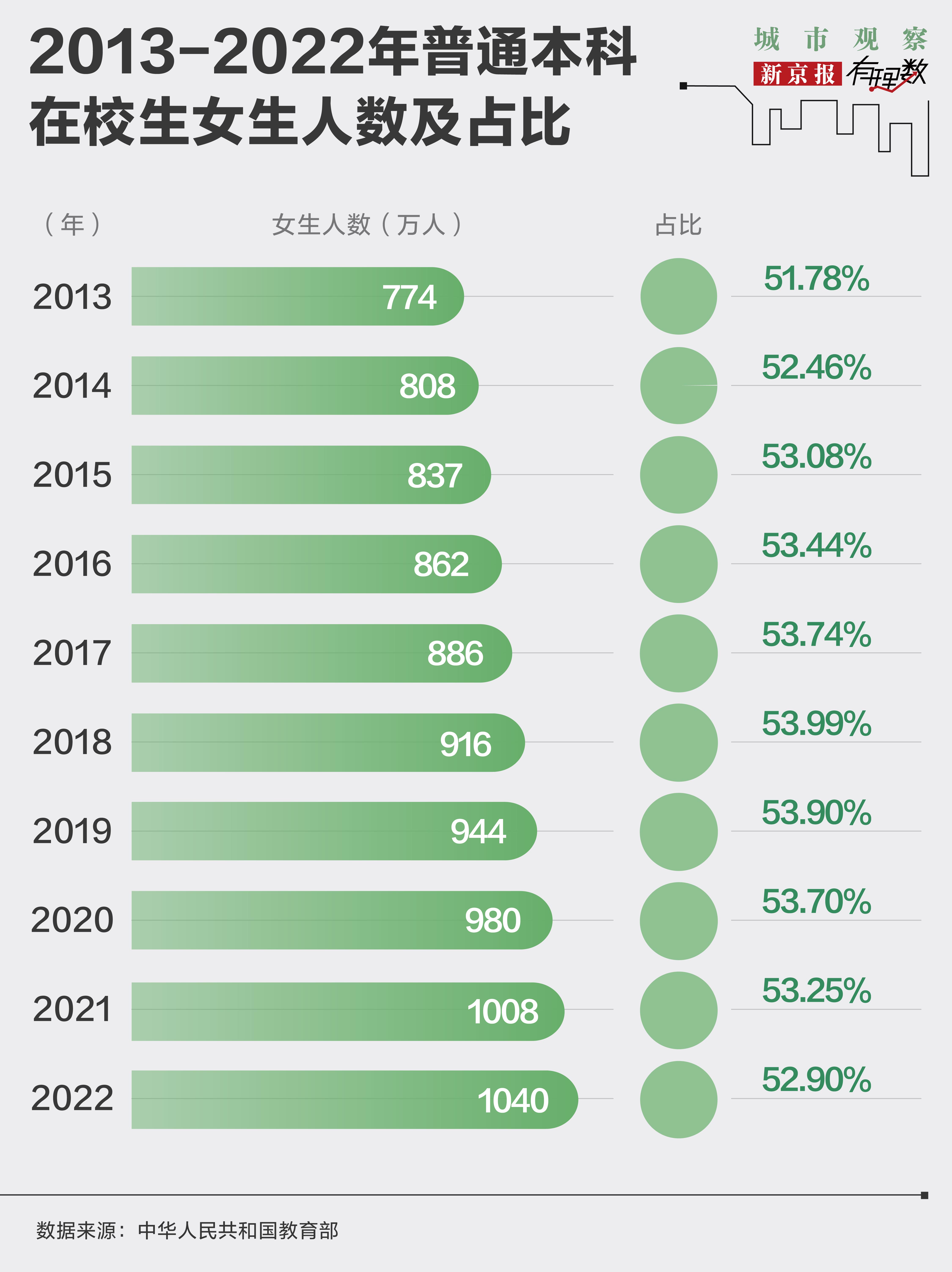 我们仍以2022年的数据为例,普通本科在校人数约为1966万人,其中女生人数为1040万人,占比52.90%。