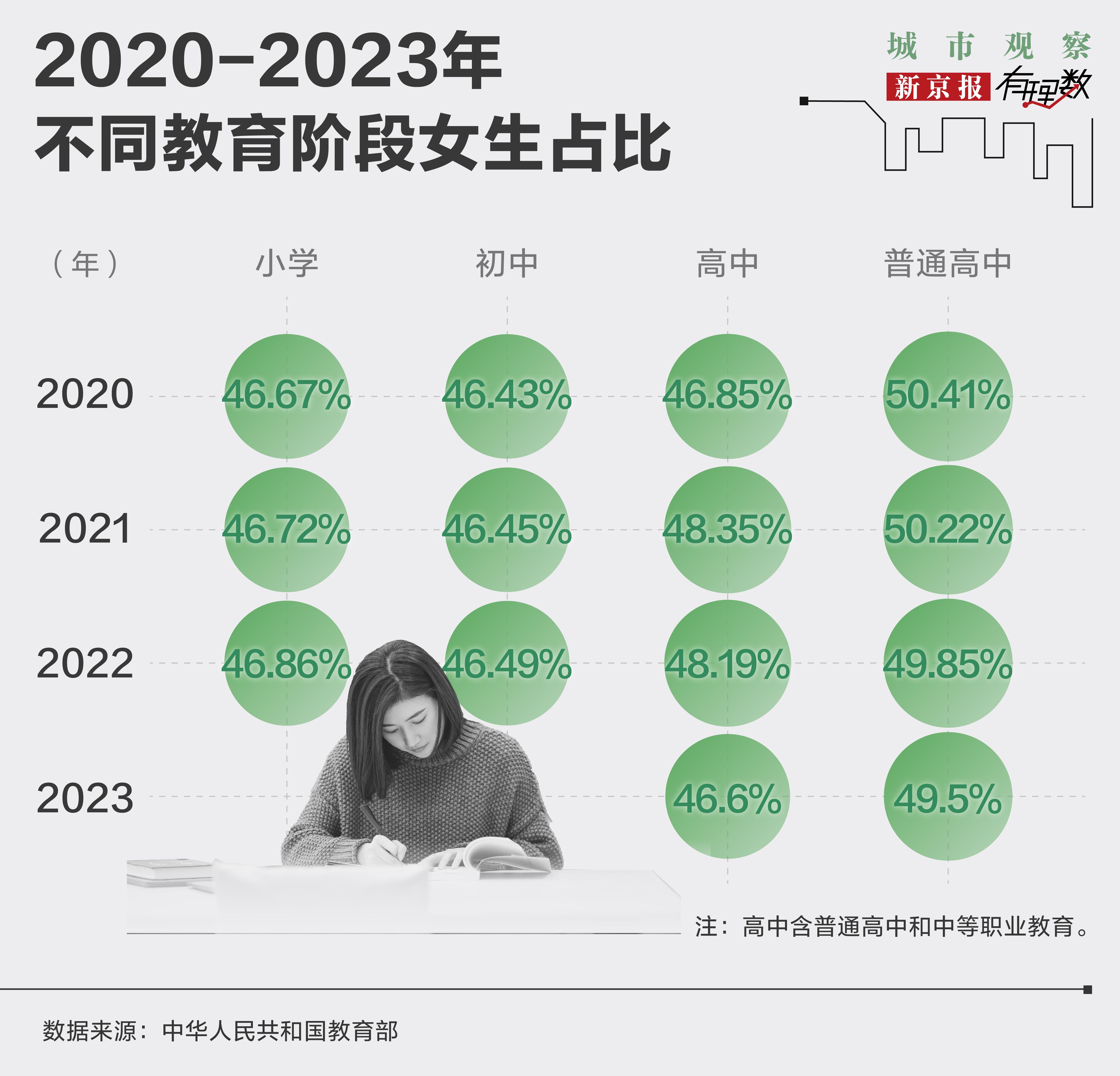 进入普通高中阶段,性别占比呈现新变化。2020年普通高中女生占比达50.41%,后续年份虽有波动,2023年为49.5% ,但整体而言,还是保持在较为均衡的水平。更多女生用努力来打通向上受教育的通道。