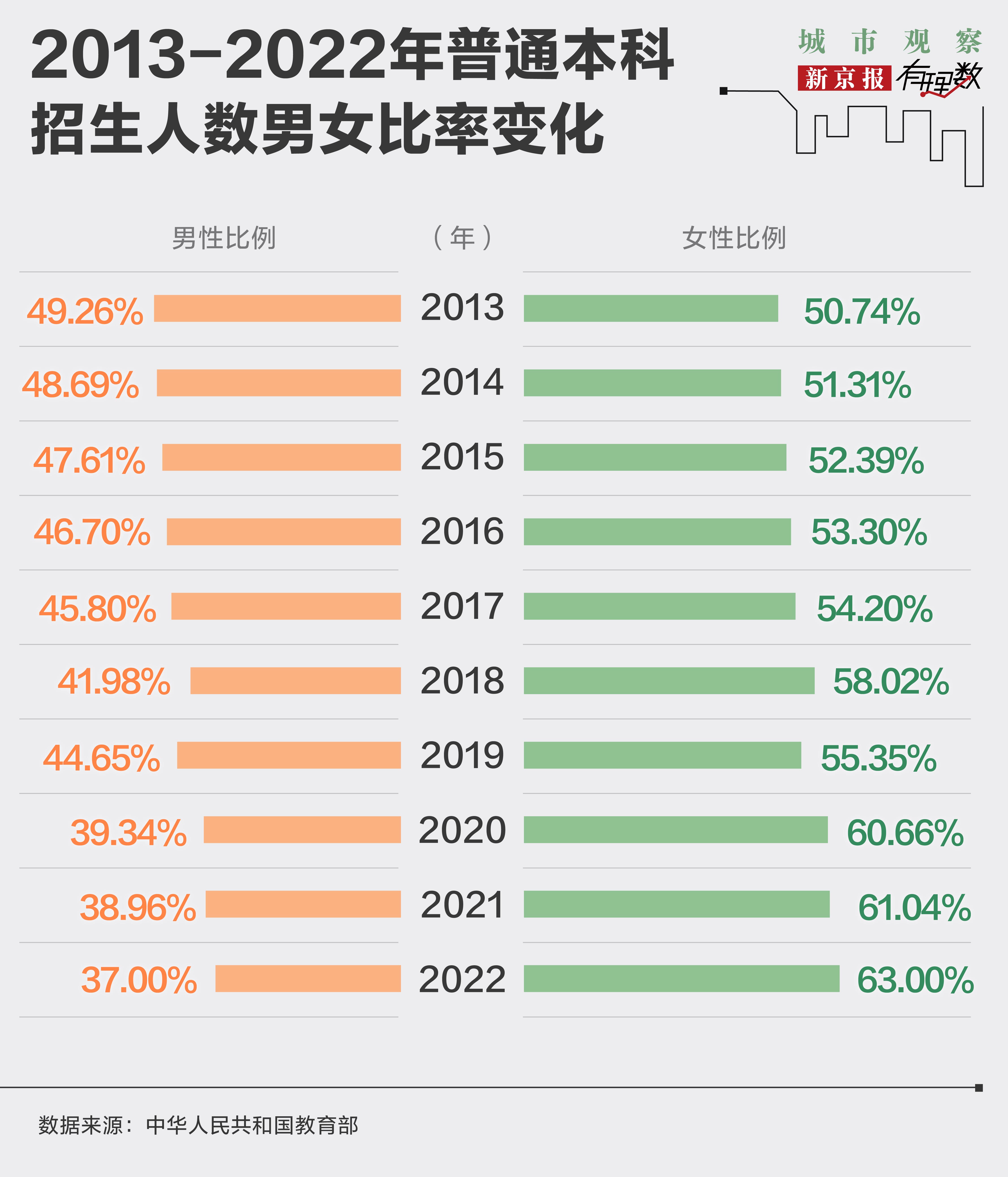在普通本科招生数上,女生已经连续14年超过男生,到2022年,普通本科招生人数中女生的比例甚至达到63%。这意味着,每63位女生拿到本科录取通知书,对应的只有37名男生,比例近似达到2:1,呈现出“阴盛阳衰”的局面。