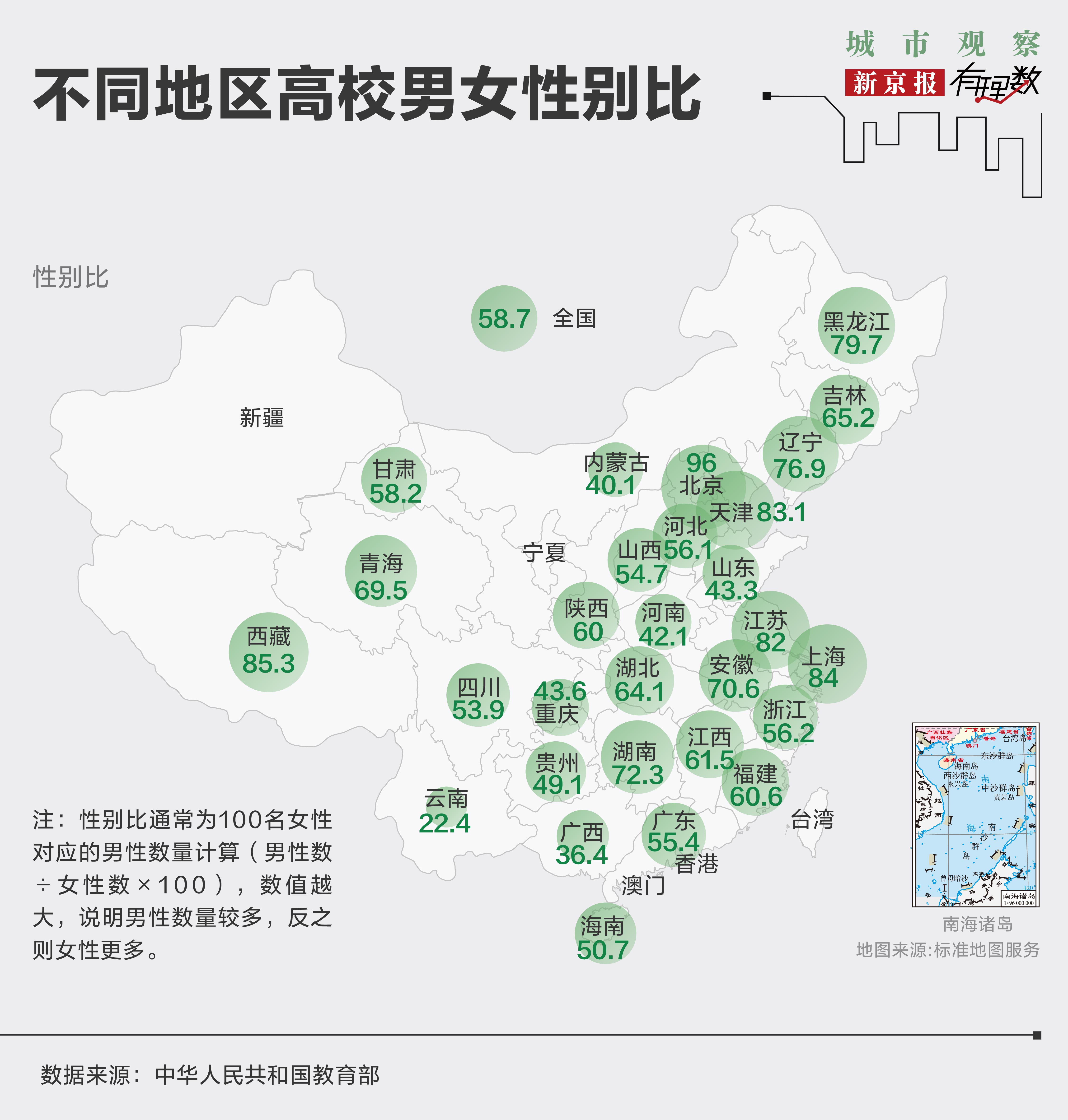 很大原因是因为不同高校、不同地区的录取比例。从2022年各地的录取比例来看,除全国平均性别比快逼近2:1之外,不少省份的数据更呈现出了“阴盛阳衰”。