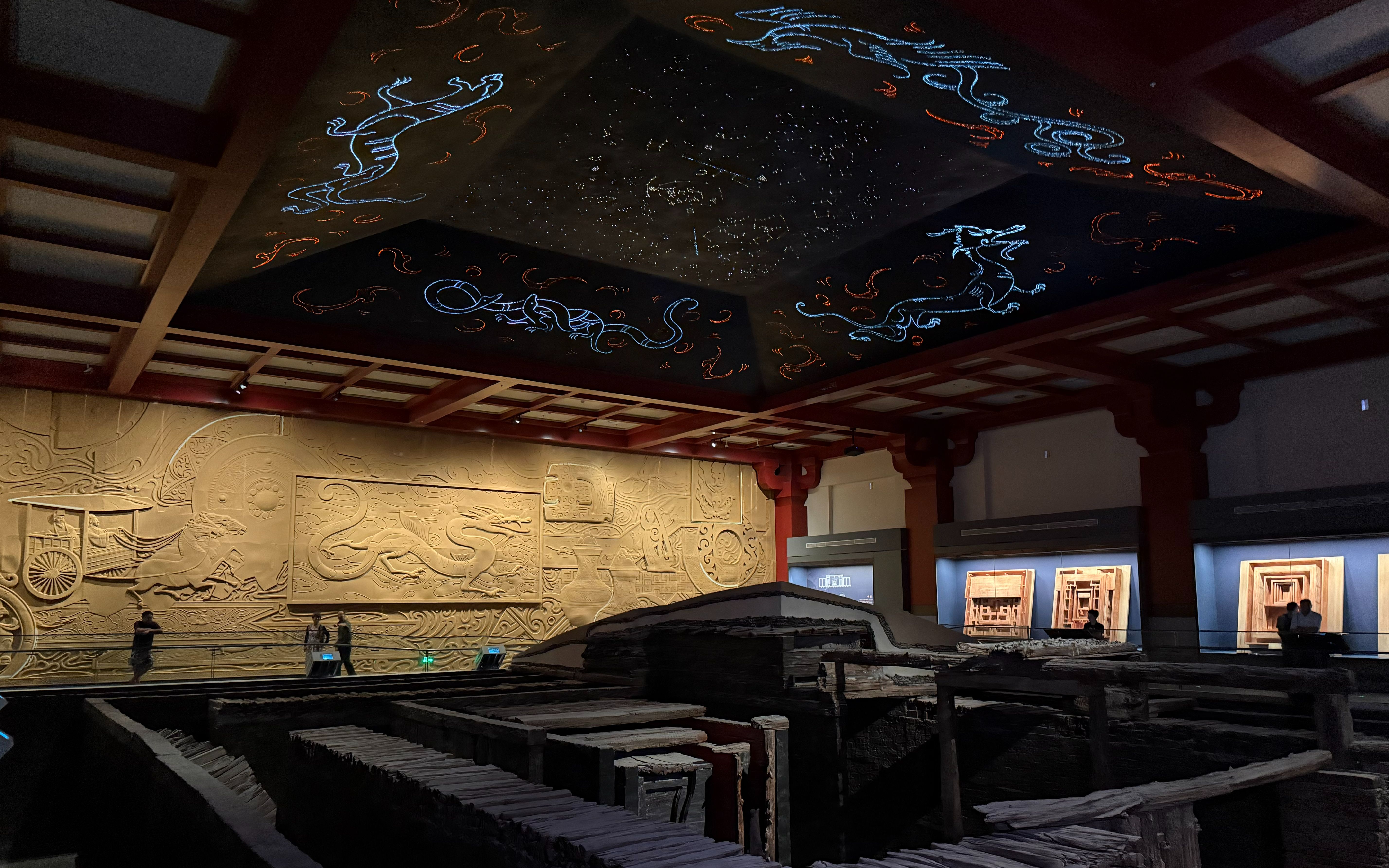 记者注意到,主墓室藻井投影重现了汉代天文图,三垣四象二十八宿随时空流转,星芒与遗址呼应,营造星河浩瀚之感。