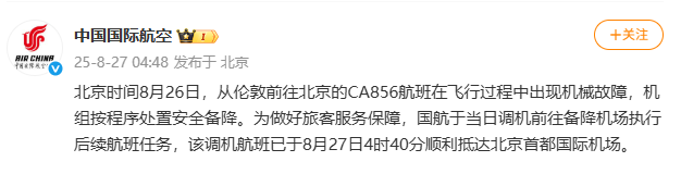 国航通报“一伦敦飞北京航班因机械故障备降”