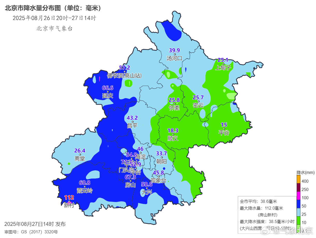 26日20时至27日14时全市平均降水量38.6毫米,城区平均44.6毫米,最大降水量出现在房山新村112.0毫米;最大降水强度出现在大兴山西营,27日12时-27日13时降水38.5毫米。最近一小时最大降水量为大兴芦城20.5毫米。