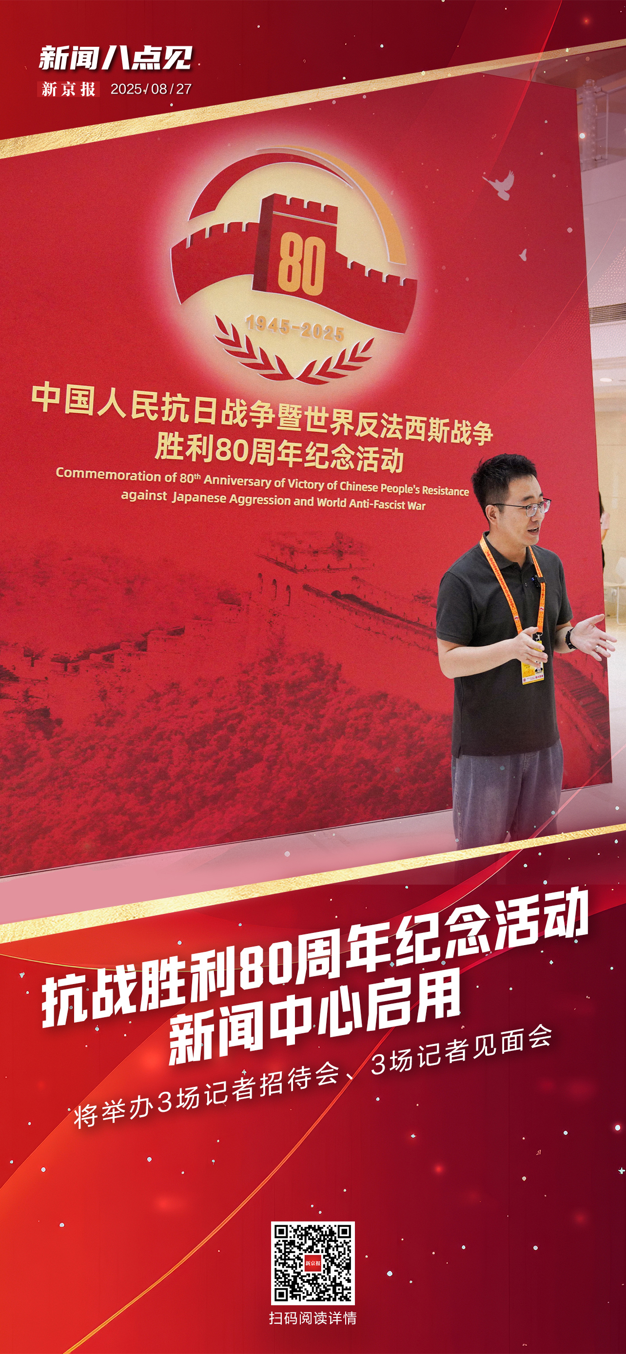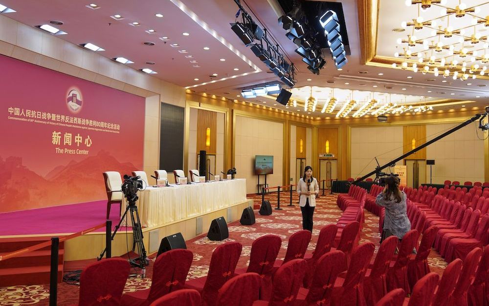 8月27日,中国人民抗日战争暨世界反法西斯战争胜利80周年纪念活动新闻中心开始对外接待服务。新闻中心设在北京梅地亚中心宾馆,安排参加纪念活动相关采访,提供传输通信手段、资料服务以及有关新闻采访方面的咨询。