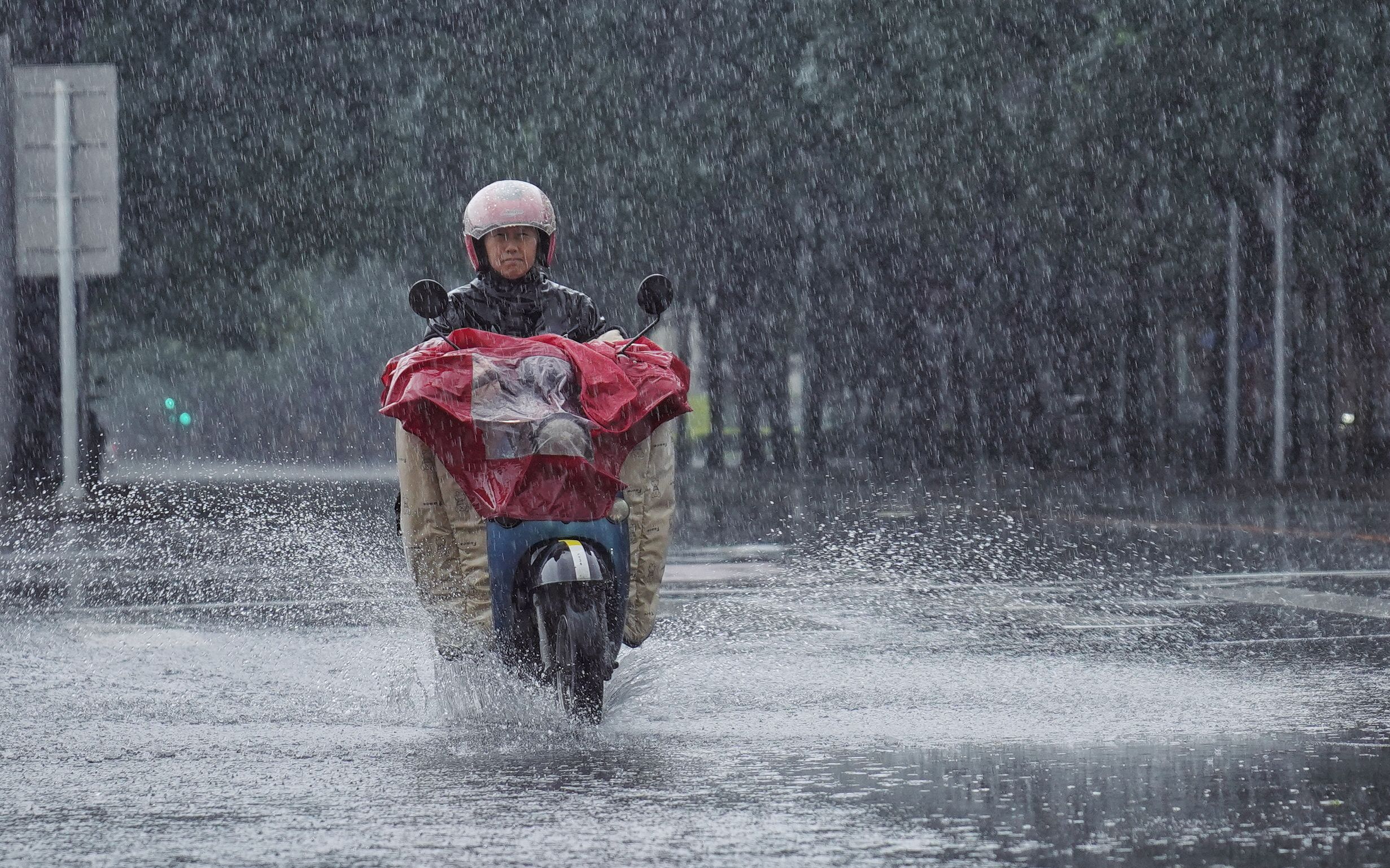 8月27日,玉渊潭南路一位市民在大雨中骑行。新京报记者 薛珺 摄