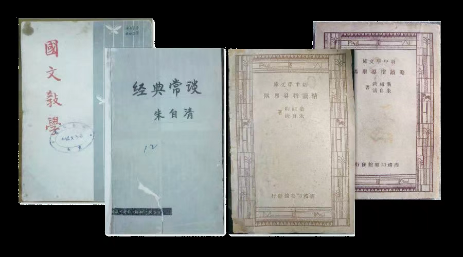 朱自清长期关注中学语文教育。他与叶圣陶合作,撰写、编选 了多部关于语文教育与学习的论著。图为抗战期间出版的部分著作。《朱自清大传》插图