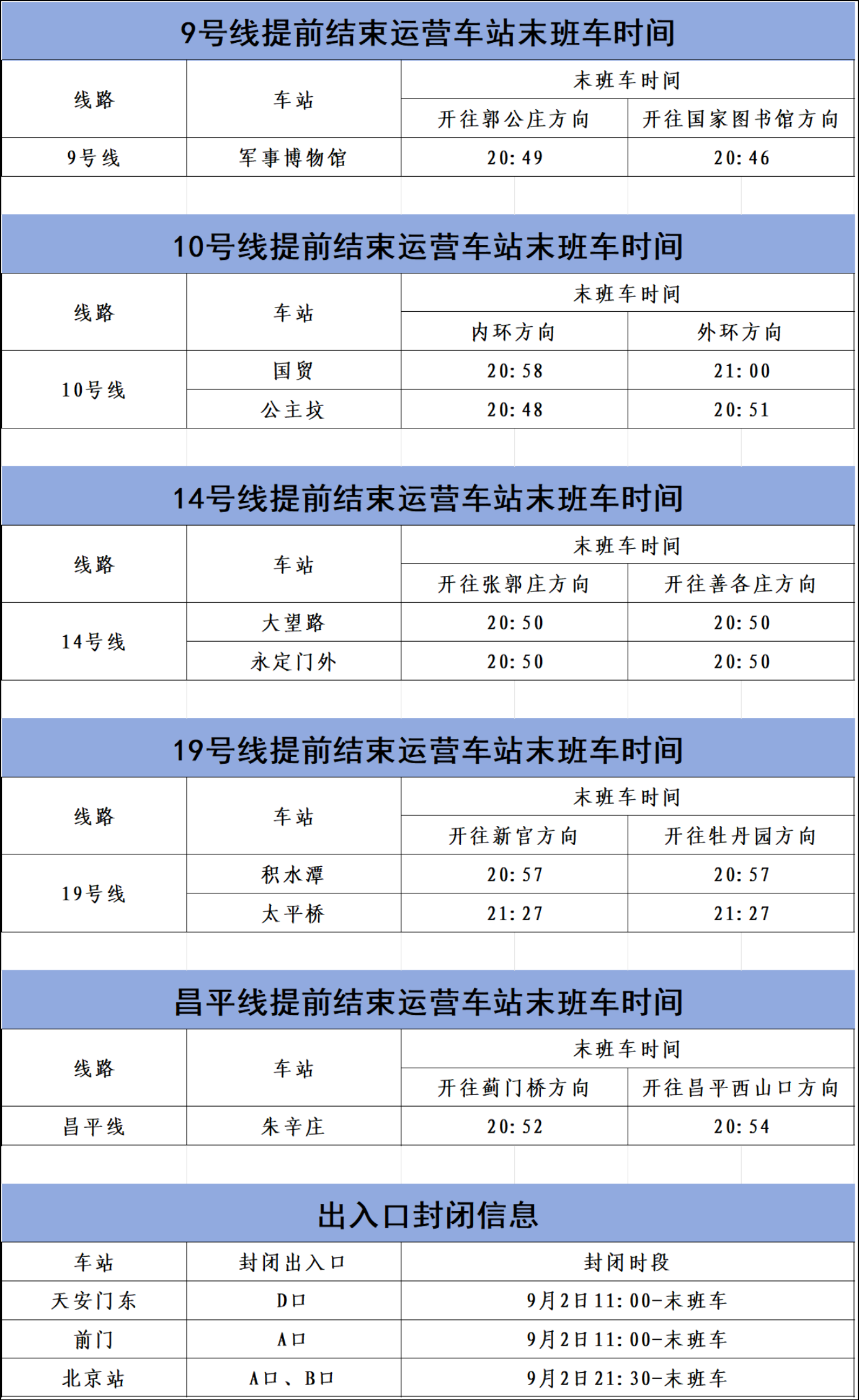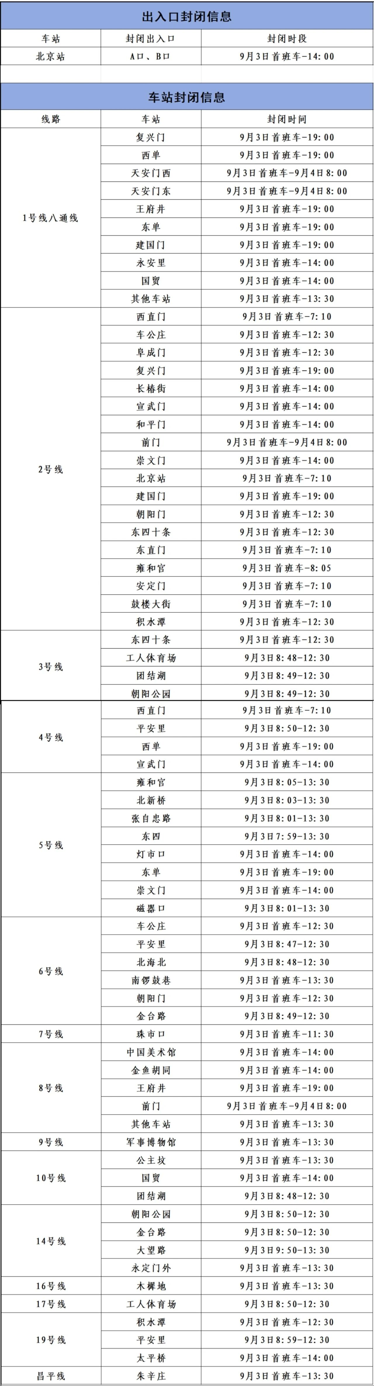 一、2025年9月3日首班车起至19:00(继续封闭车站除外),地铁1号线八通线、2号线、3号线、4号线、5号线、6号线、7号线、8号线、9号线、10号线、14号线、16号线、17号线、19号线、昌平线部分车站、出入口分时段封闭。