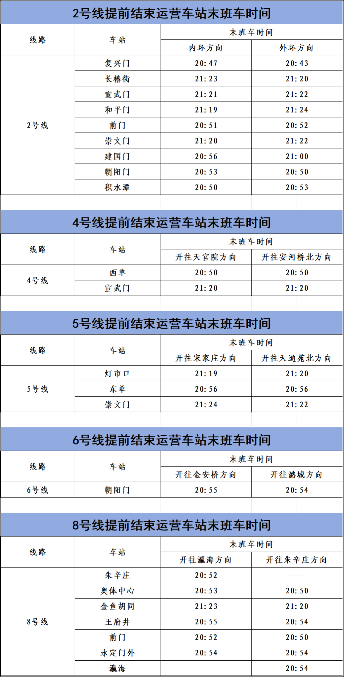 二、2号线前门、朝阳门、积水潭,6号线朝阳门,8号线朱辛庄、奥体中心、王府井、前门、永定门外、瀛海,14号线永定门外,19号线积水潭,昌平线朱辛庄,上述车站21:00前陆续封闭。