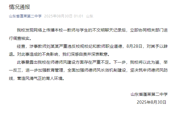 新京报讯 8月30日,山东省蓬莱第二中学微信公号发布情况通报:我校发现网络上传播本校一教师与学生的不文明聊天记录后,立即协同相关部门进行调查核实。