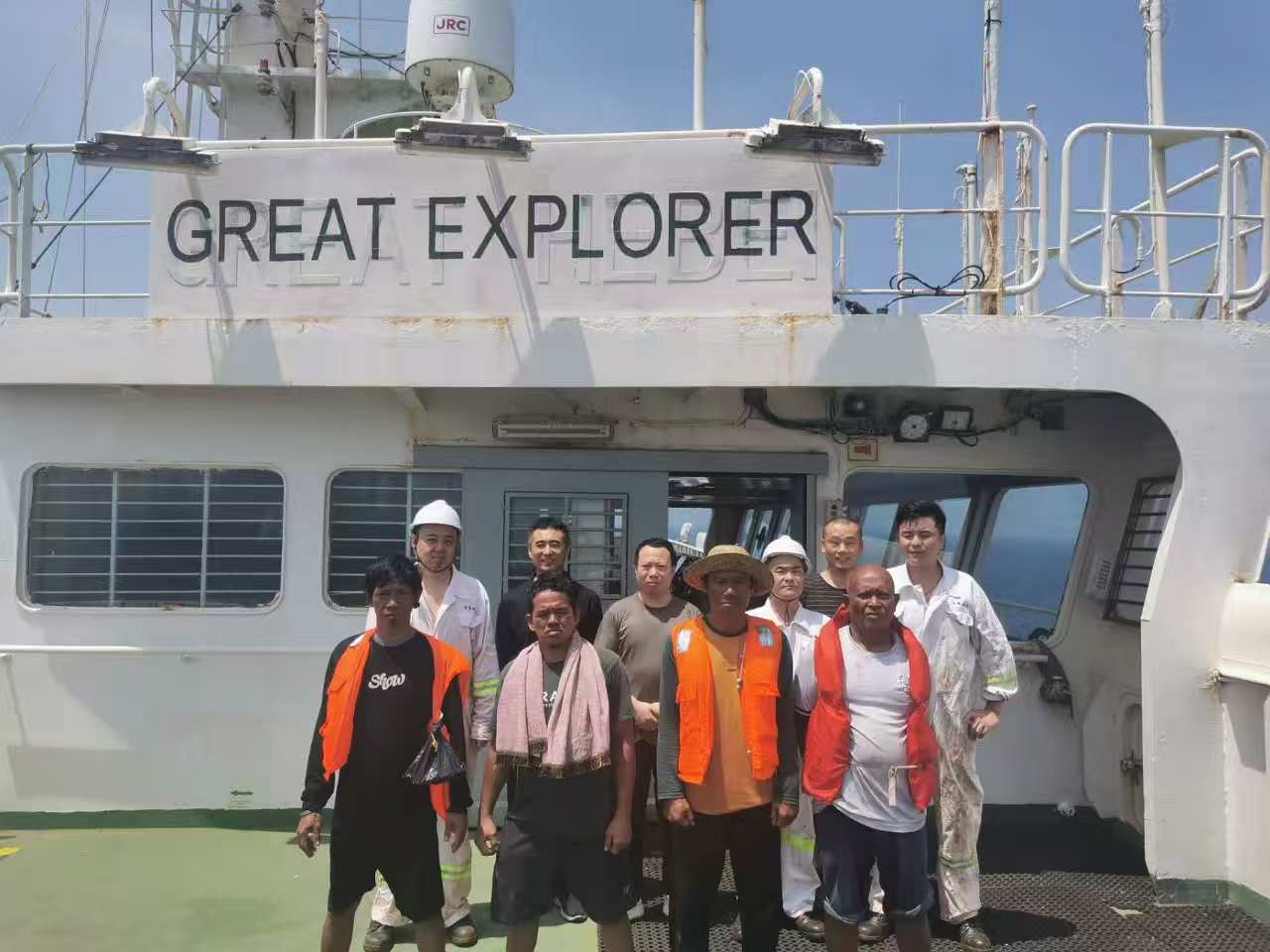 参与救援的船员及4名获救渔民在“伟大开拓”轮上合影。 受访者供图