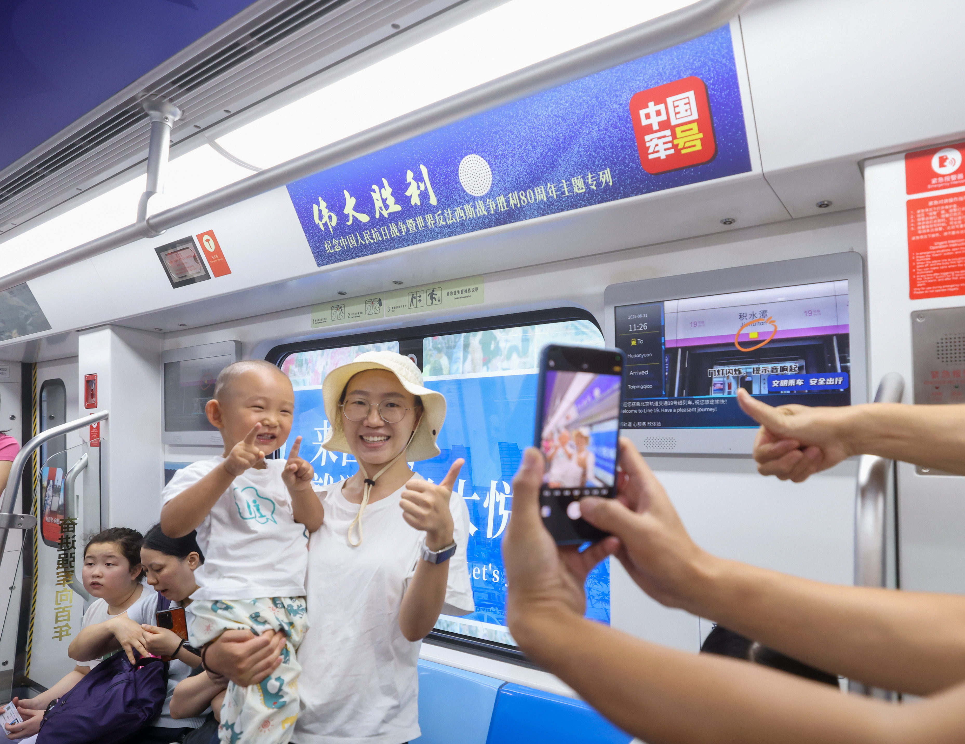 乘客带着孩子在北京地铁19号线“伟大胜利”主题专列上拍照留念。新京报记者 王贵彬 摄