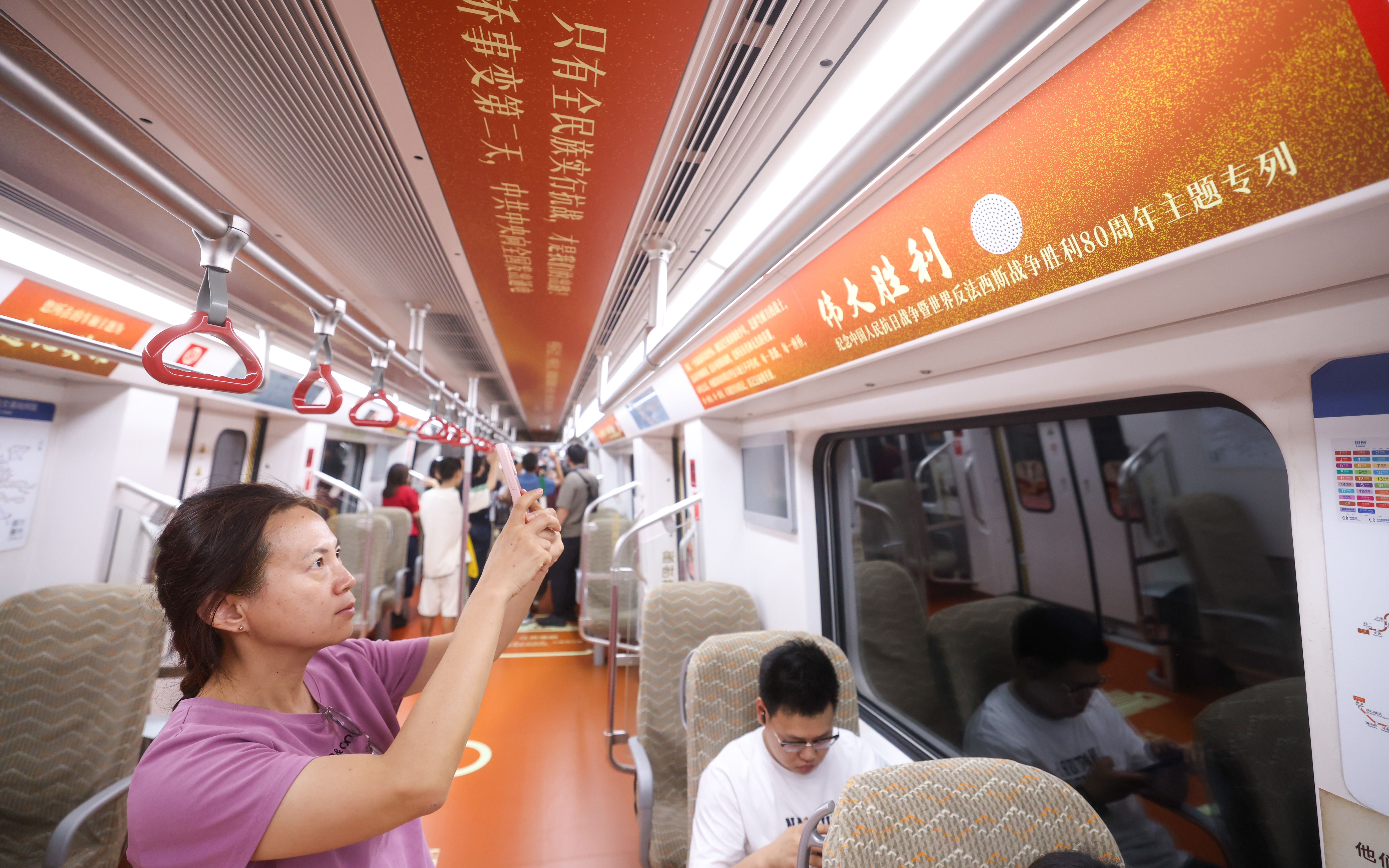 据了解,“伟大胜利”主题专列共包含7个主题,每个车厢内都融入了抗战历史元素与强军时代风貌,通过图文展示、主题涂装、在线互动等形式,生动再现中国人民在抗日战争中浴血奋战的英雄事迹,展现新时代人民军队赓续红色血脉、聚力强军兴军的使命担当,让乘客在交通出行中沉浸式感受历史的厚重与时代的荣光。本次“伟大胜利”地铁19号线主题专列于8月31日至9月30日期间每周二、三、四、六、日上线运行。