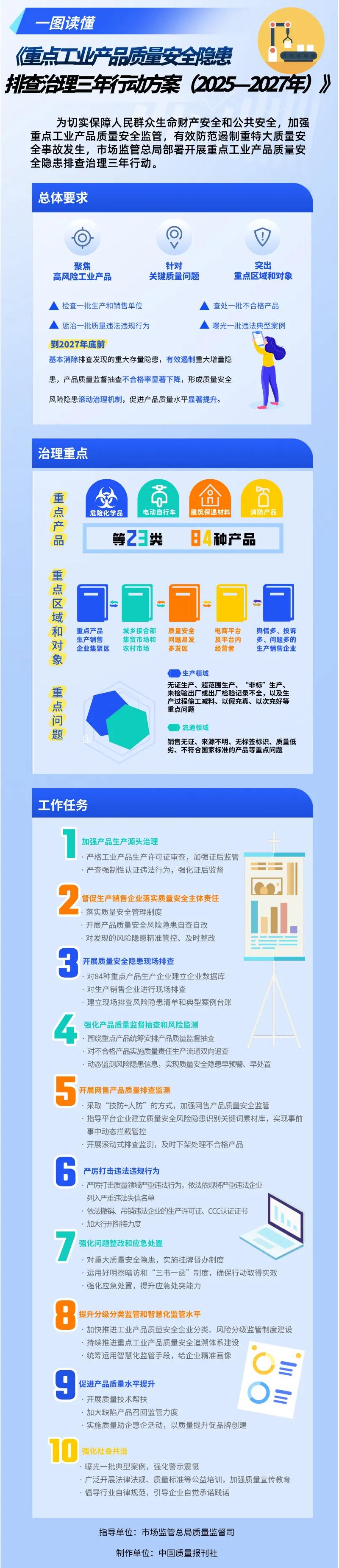 新京报讯 据市说新语消息,为保障人民群众生命财产安全和公共安全,有效防范遏制重特大质量安全事故发生,市场监管总局近日印发《重点工业产品质量安全隐患排查治理三年行动方案(2025—2027年)》,聚焦消防产品、建筑保温材料、电动自行车等23类84种高风险产品,针对关键质量问题,突出重点区域和对象,部署各地市场监管部门开展隐患排查治理。