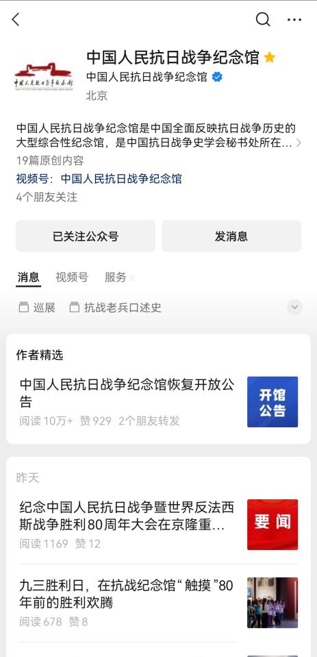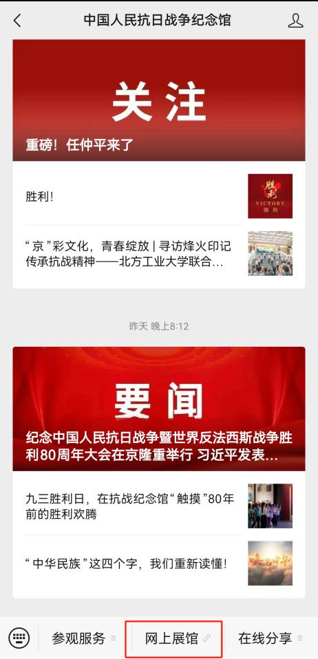 微信公众号关注“中国人民抗日战争纪念馆”,点击菜单栏“网上展馆”直接进入网上展馆,随时随地重温历史、缅怀先烈。