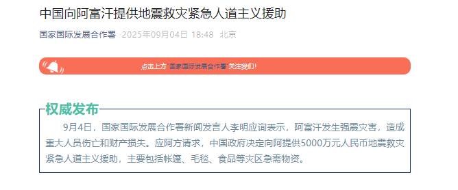 新京报讯 据国家国际发展合作署消息,9月4日,国家国际发展合作署新闻发言人李明应询表示,阿富汗发生强震灾害,造成重大人员伤亡和财产损失。应阿方请求,中国政府决定向阿提供5000万元人民币地震救灾紧急人道主义援助,主要包括帐篷、毛毯、食品等灾区急需物资。