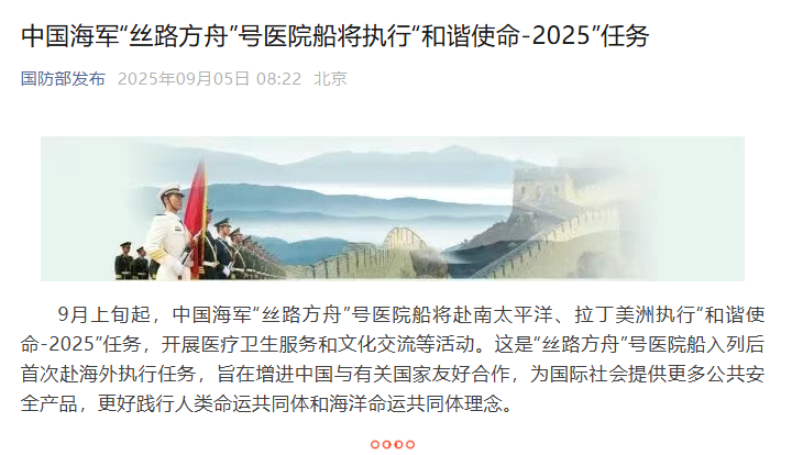 新京报讯 据国防部发布微信公众号消息,9月上旬起,中国海军“丝路方舟”号医院船将赴南太平洋、拉丁美洲执行“和谐使命-2025”任务,开展医疗卫生服务和文化交流等活动。这是“丝路方舟”号医院船入列后首次赴海外执行任务,旨在增进中国与有关国家友好合作,为国际社会提供更多公共安全产品,更好践行人类命运共同体和海洋命运共同体理念。