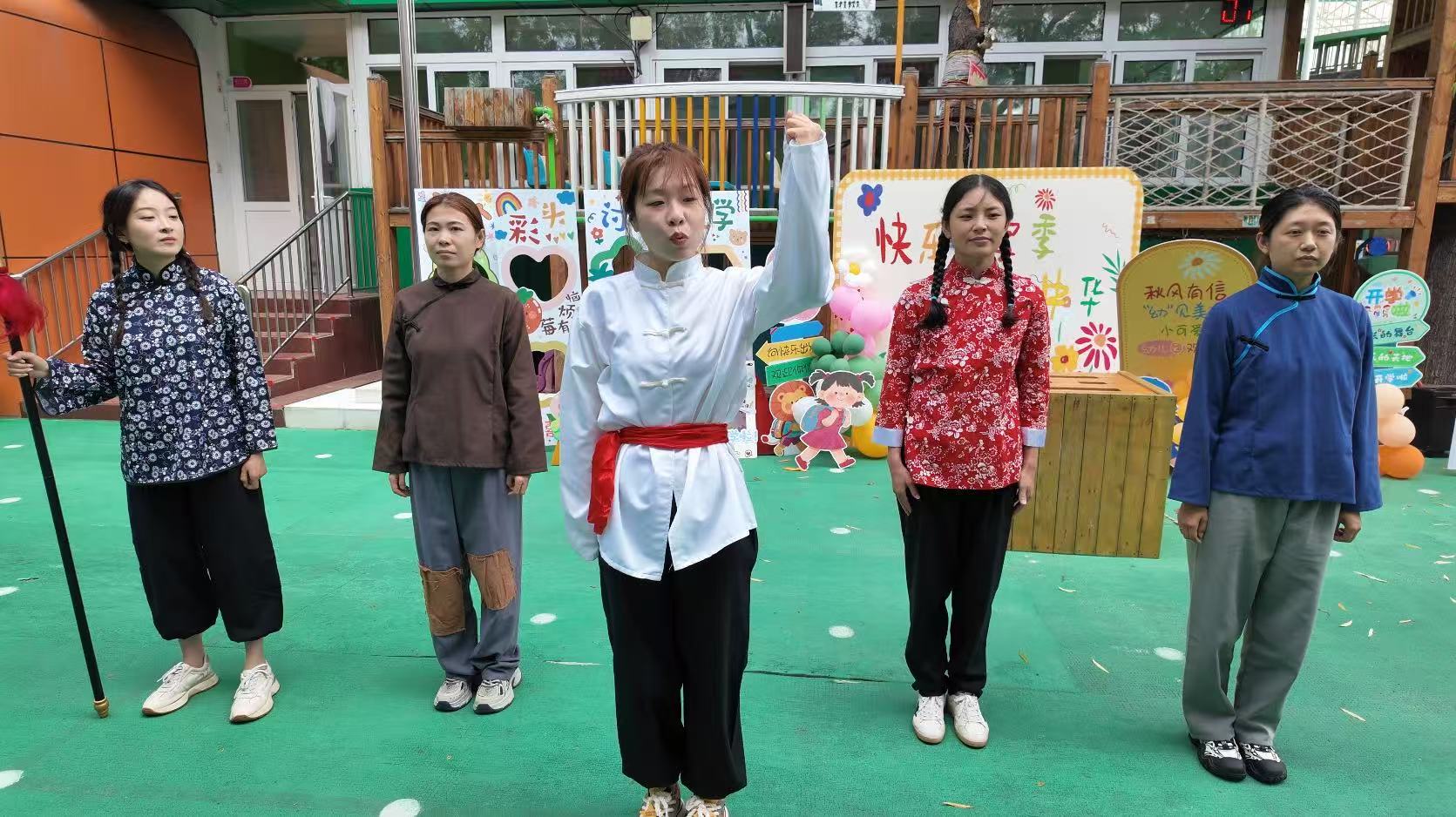 东四五条幼儿园党员教师带领孩子们演绎抗战短剧。学校供图