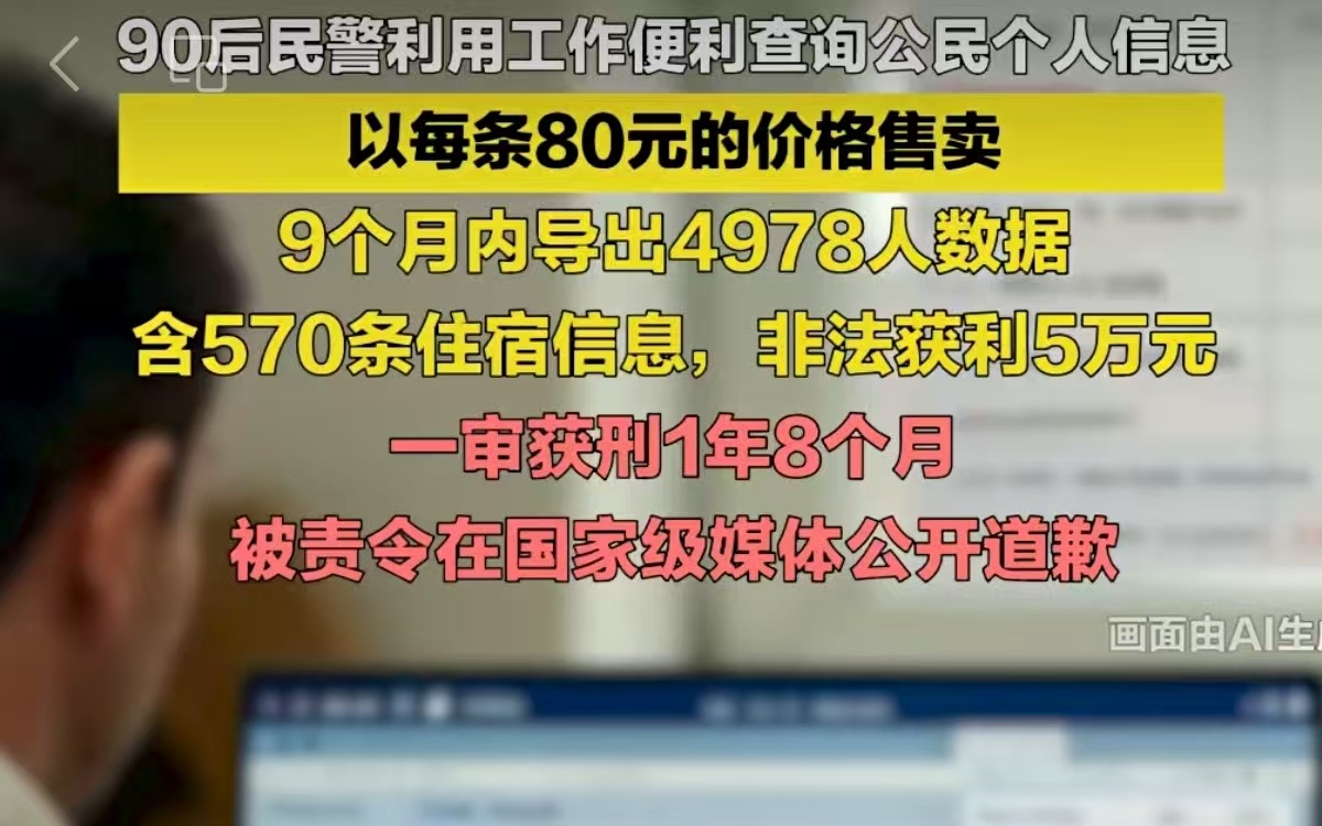 “90后”民警李某甲利用工作职务便利,查询公民个人信息,以每条80元的价格售卖,在9个月时间里导出近5000人的数据,包括近600条公民住宿信息,非法获利5万元。