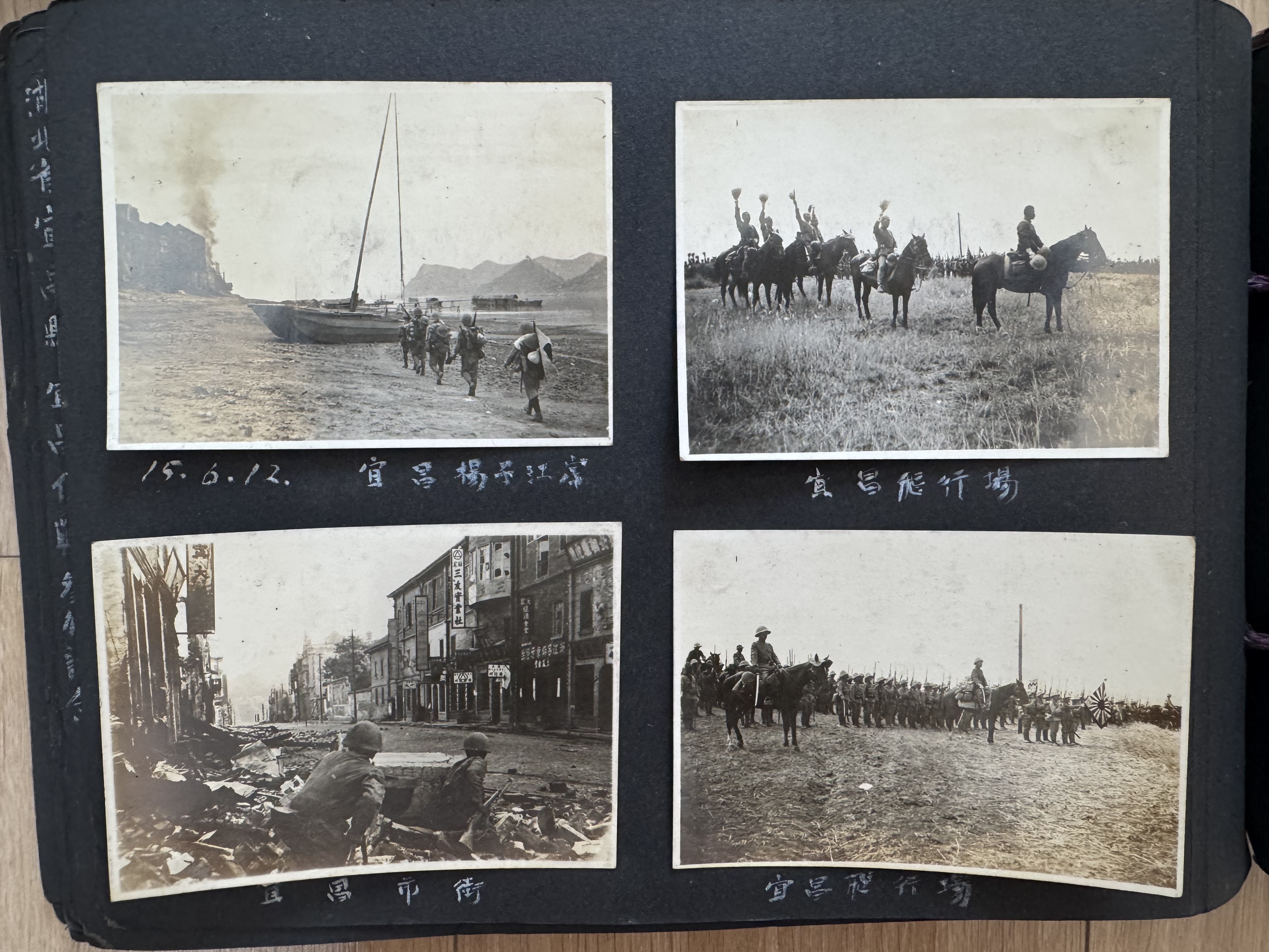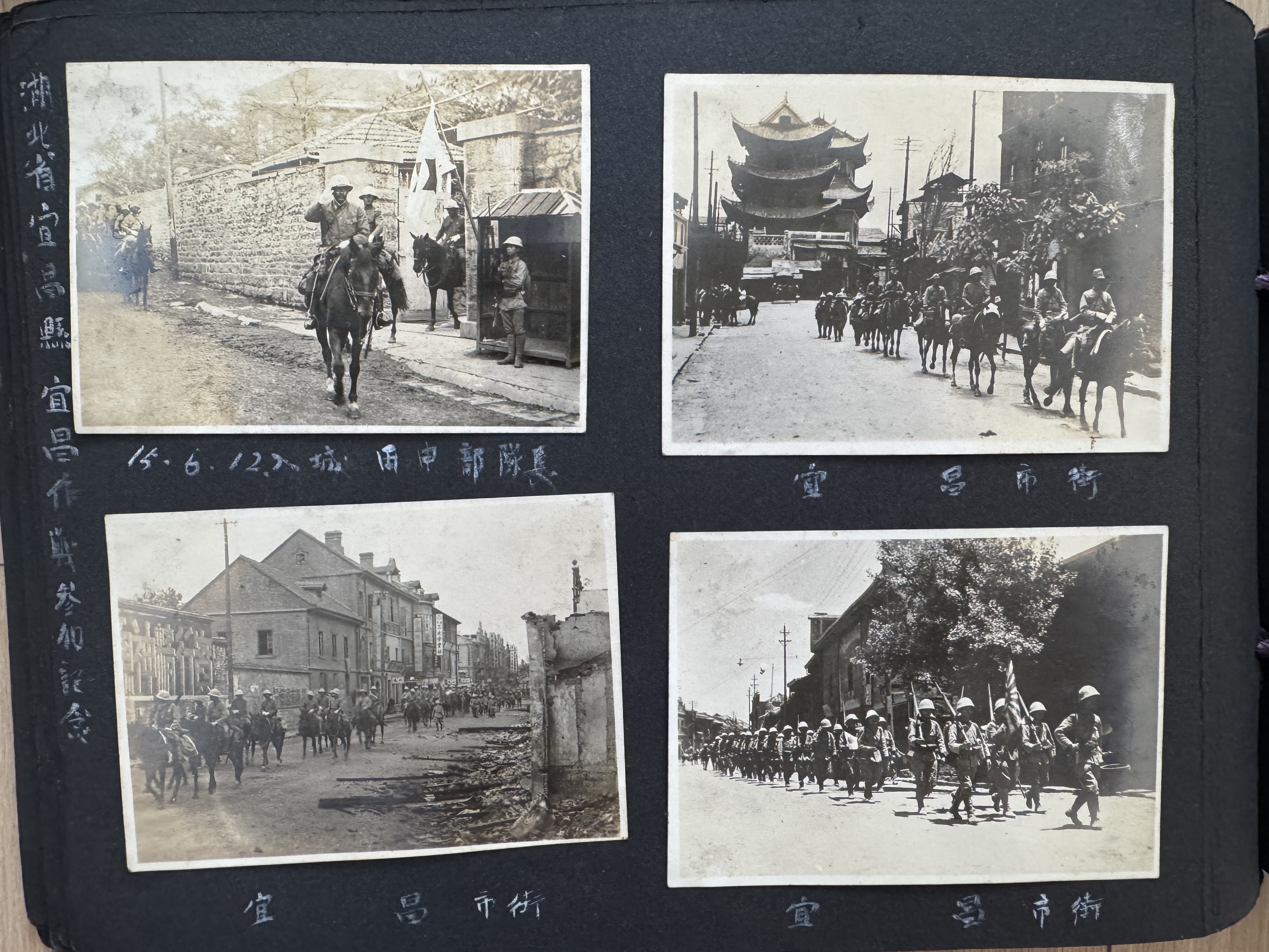 其中一张照片标注有“15.6.12 入城 田中部队长”字样,一名日本军人坐在大马上敬礼。“15”指的就是昭和十五年,即公元1940年。1940年6月12日正是宜昌沦陷日。“田中部队长”全名田中静一,时任日军第十三师团长。该师团连同第三师团、第三十九师团共同发动了当年的枣宜会战。