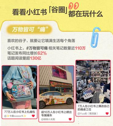 近两年,谷子经济和痛文化席卷线下。“吃谷”这一IP衍生的周边内容消费,已成为许多年轻人的日常生活仪式,在小红书上,“谷子”相关笔记数量近615万,累计阅读超过330亿,过去一年同比增长超过160%。新一代年轻人不仅买谷、晒谷,更要“一边吃谷一边痛”,用谷子填满生活中的每个角落。报告显示,在小红书上,有超77万人分享自己的痛包,10万人打造了了自己的痛车,万物皆可痛相关话题阅读量超过130亿。