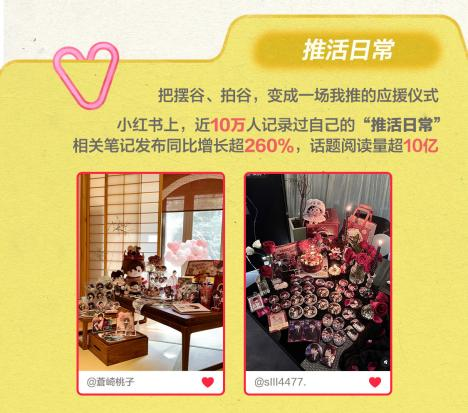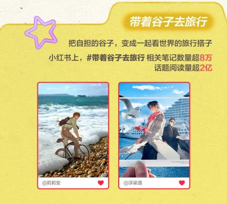 “痛式文化”风靡的背后,谷子早已不仅是一种IP周边,更代表着喜爱角色的现实投射和情感陪伴。除了“痛文化”,在小红书上,有超过20万年轻人带着谷子去探店拍照,为角色“推活”(应援),相关笔记发布过去一年同比增长超260%;还有二次元同好会带着谷子去旅行,让动漫游戏角色也能成为一起看世界的旅行搭子,相关话题阅读量超2亿。