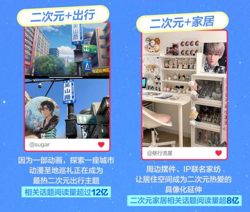 在小红书上,有二次元爱好者把婚礼布置成自己喜欢的动漫同款,让喜欢的角色来见证自己人生的关键时刻;有人给自己痛了一个二次元主题的家,二次元出游也正在成为一种兴趣旅游风潮——在小红书,动漫圣地巡礼的相关话题阅读量超12亿,许多同好因为一部动漫,而开启一次取景地同款打卡之旅。