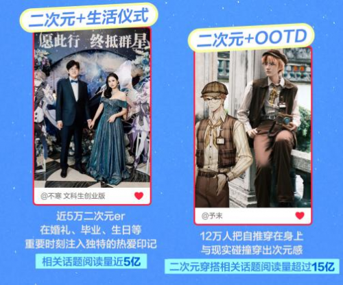 而这种从收藏到陪伴、从线上分享到线下实践的转变,只是二次元融入现实的一个切面。除了谷子与痛文化,二次元文化正在以沉浸的方式,介入年轻人的人生重要时刻与日常生活的各个场景。