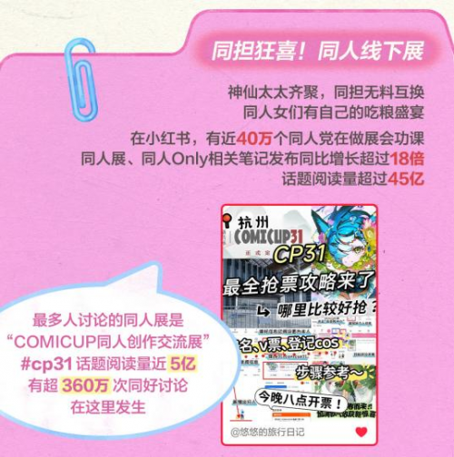 由此衍生的同人文化,近几年也在线上线下迎来了进一步的爆发。在小红书上,「同人/oc」相关笔记数量超2400万,笔记发布同比增长超过220%,累计阅读量超2600亿。而在线下,以CP展(COMIC UP同人创作交流展)为代表的同人展/同人Only也逐渐在国内兴起,在小红书上,其相关话题阅读量已超过45亿,过去一年相关笔记发布同比增长超18倍。