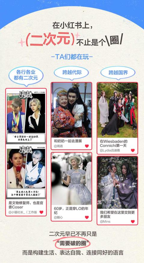 如今,在小红书上,不少二次元爱好者,会和父母一起逛漫展、出COS。70岁的@王师傅每天摸鱼 退休后和妻子一起陪着女儿逛漫展,当女儿的COS搭子。二次元不再是不被理解的爱好,而是成为代际之间理解和共情的纽带。二次元也不再只是年轻人的专属,60岁的@随心奶奶,在小红书分享了自己穿着Lolita裙子逛CP31展的故事,在她看来,“60岁正是穿Lo裙的年纪”。