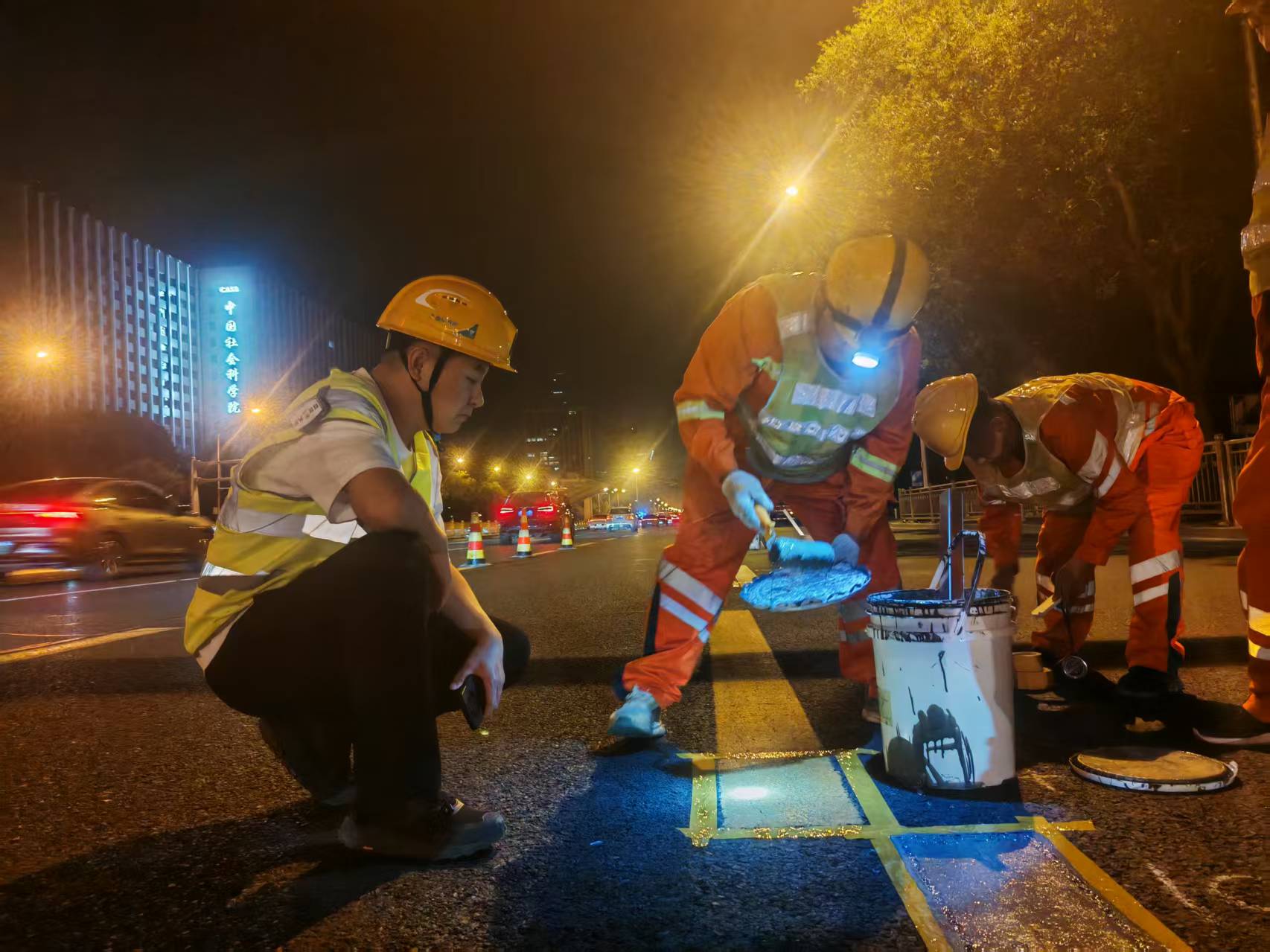 工程人员检查新型涂料对旧标线遮盖效果。北京市交通委供图