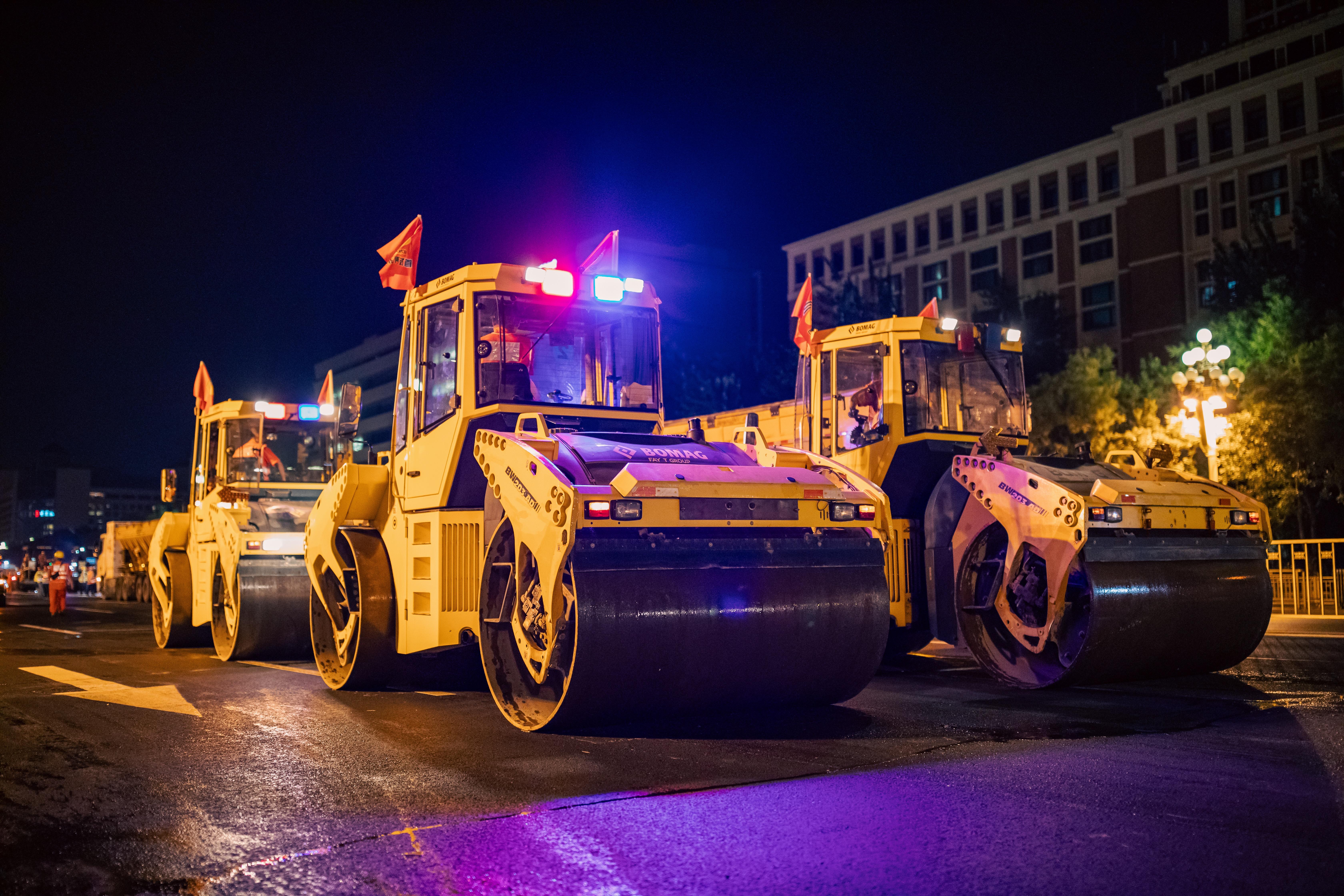 施工全部在深夜的“5小时窗口期”内进行,道路养护部门进行路面摊铺、碾压作业。北京市交通委供图