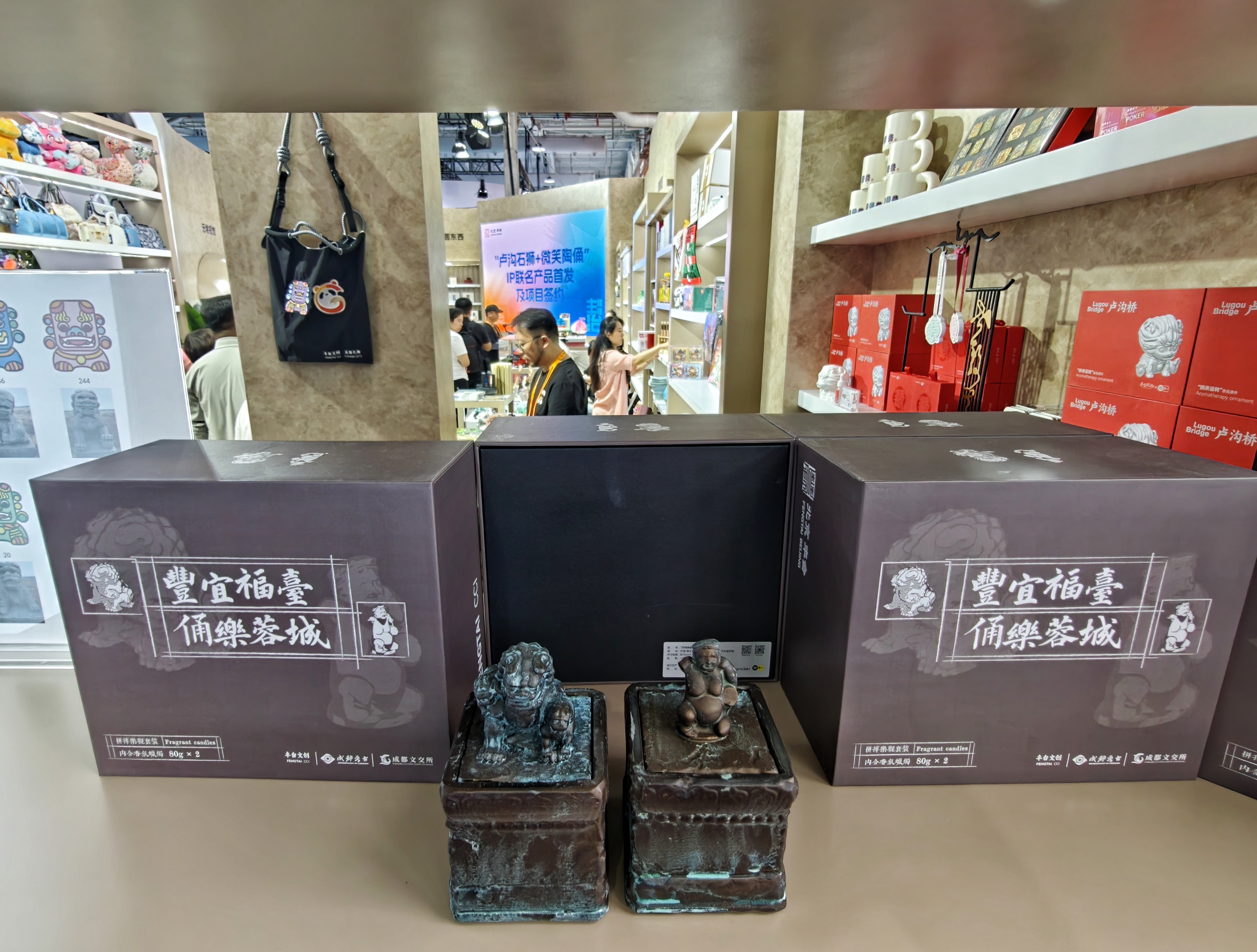 据企业负责人介绍,他们是随成都文化产权交易所和成都市文物考古研究院来参展的。服贸会期间,丰台区联动两家单位,共同发布“卢沟石狮+微笑陶俑”IP联名香薰蜡烛。