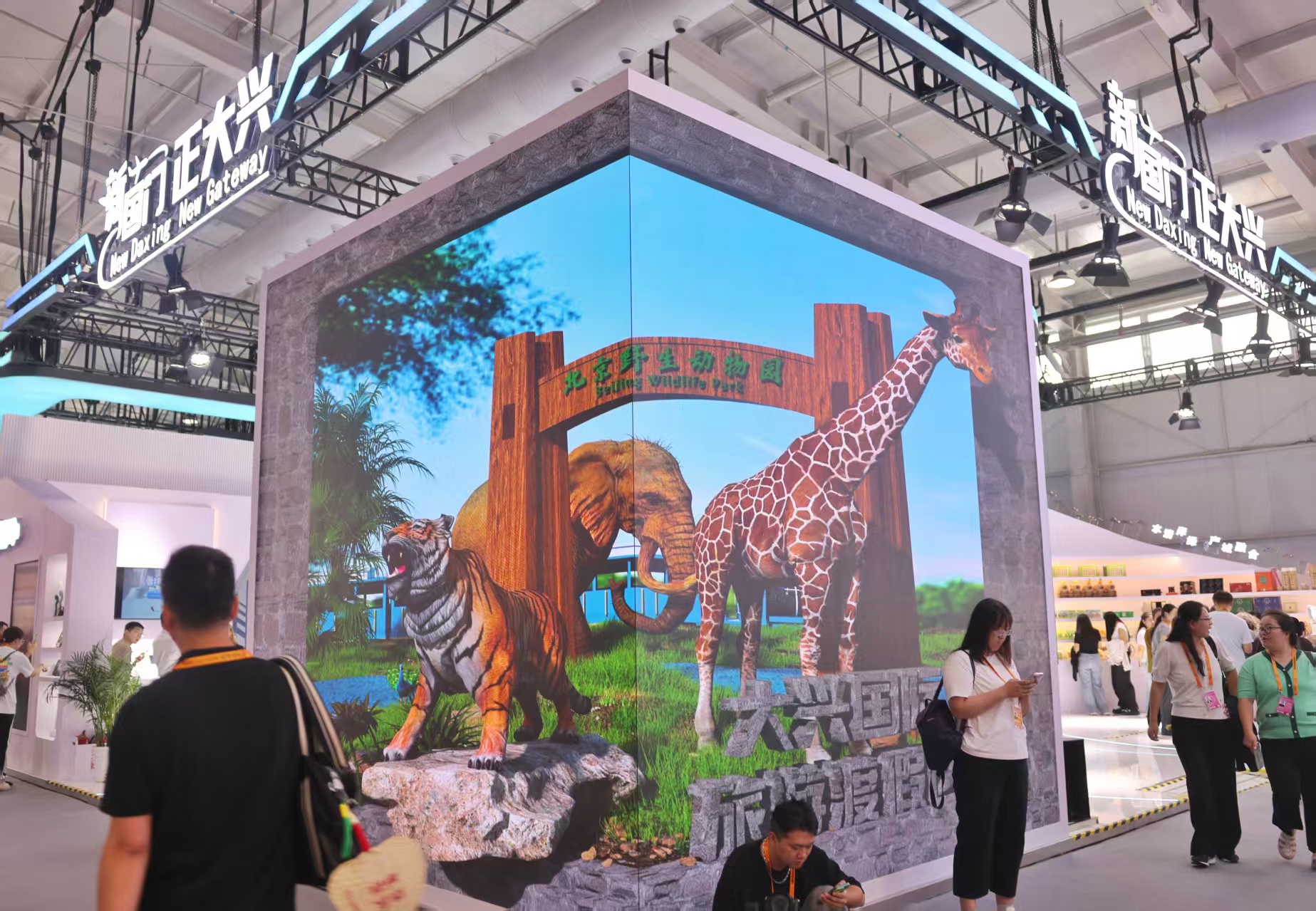 在大兴展区入口,长8米、高4米的裸眼3D大屏成为“吸睛担当”。“凤凰腾飞”开篇,依次呈现大兴机场展翅、氢能汽车穿梭、商业航天崛起、生物医药科技、数字经济发展以及永定河生态画卷,配合“世界向东,北京向南”等艺术化表达,吸引大批参观者驻足打卡,不少人举起手机记录这一视觉盛宴。