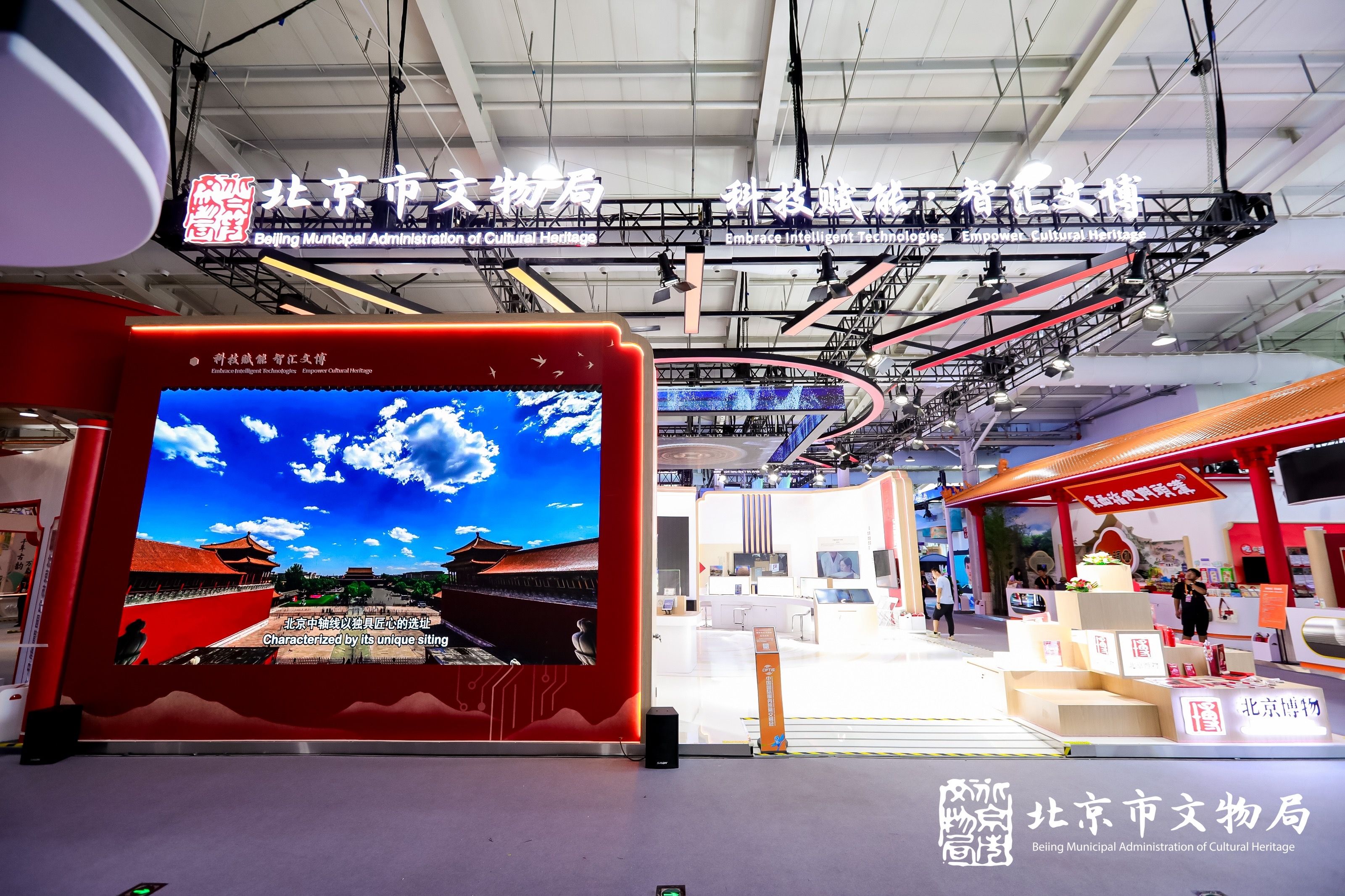 “北京博物甄选文创”专区展售各类博物馆文创精品及中轴线主题文创新品,观众不仅可以一次性欣赏众多由博物馆馆藏文物精品转化而来的文创产品,还可以把它们带回家;“科技考古与文物保护”专区展示前沿科技在考古与文物保护中的应用实践,观众可以了解科技手段如何帮助考古工作者开展对考古现场的数字化留存与微观分析,了解当前文物保护的智能化手段。