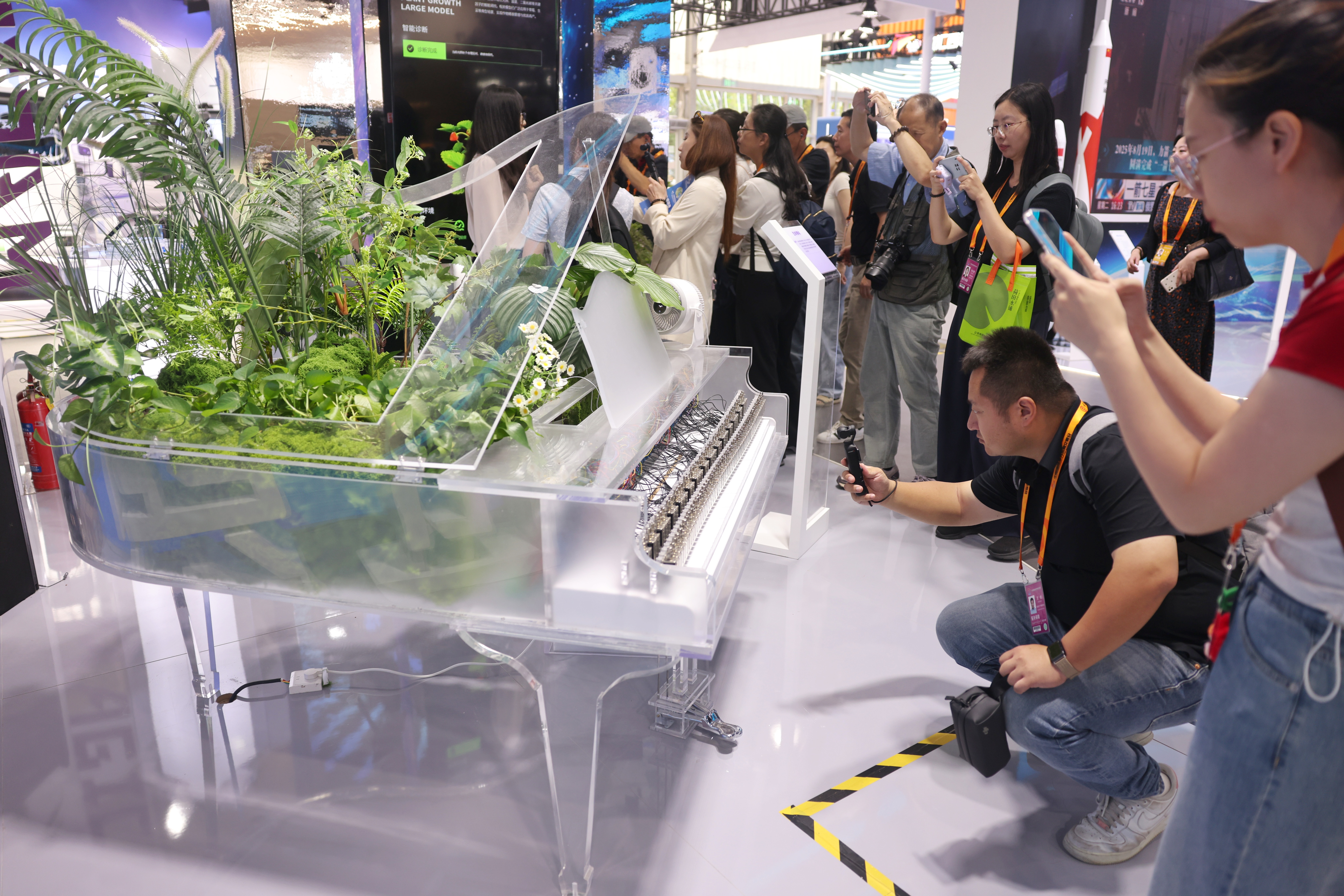 展区的“模数世界”板块则集中展示了亦庄在人工智能领域的新成果。现场,一台“长”满植物的钢琴琴声悠扬,弹琴的不是演奏者,而是一蓬绿油油的植物。展区的工作人员告诉记者,这台特殊的钢琴采用电极传感器采集植物信号,通过AI+音乐大模型的计算,转化一段优美的旋律。