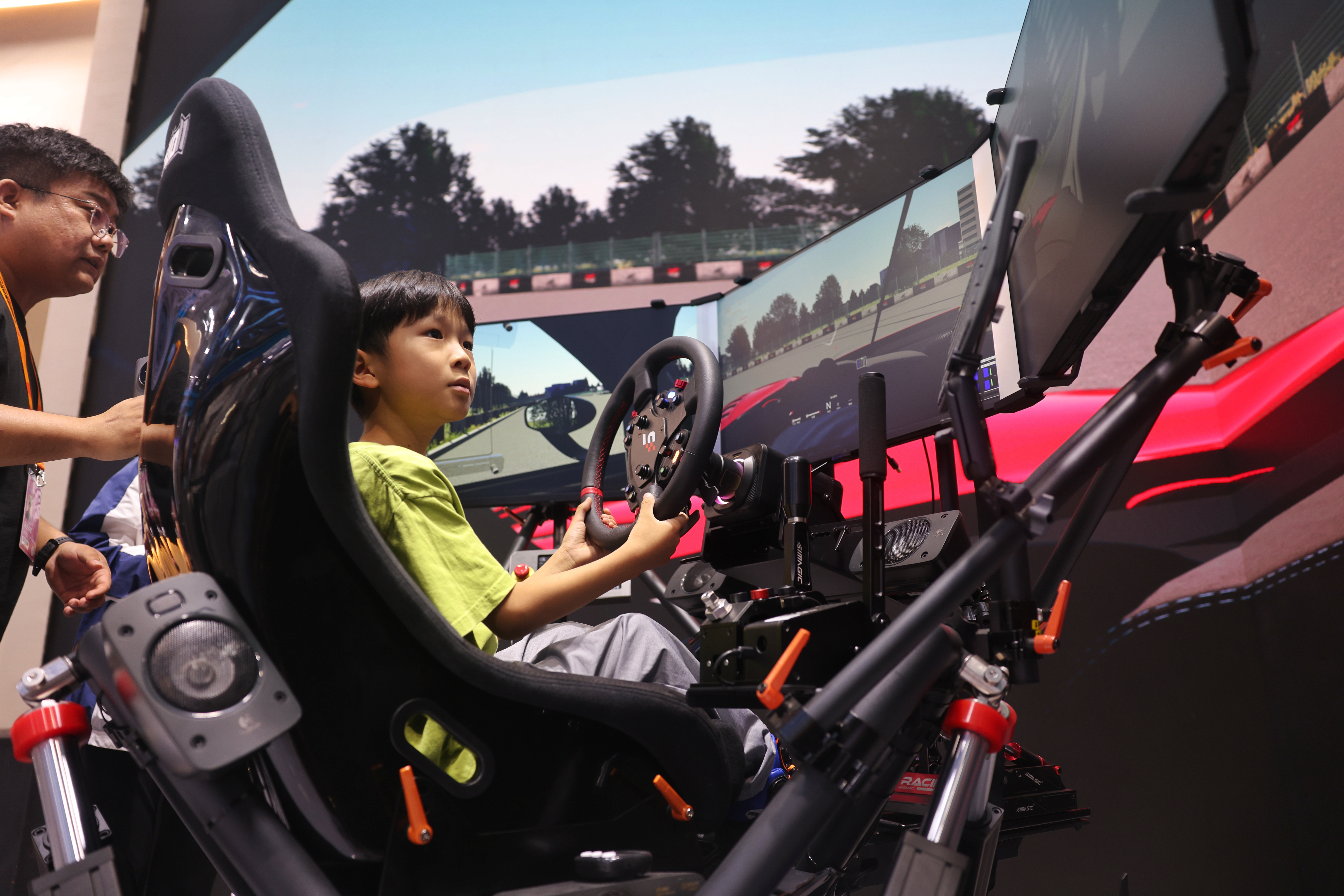 展区内,数字人YURI英姿飒爽地“站”在赛道上,配合逼真音效,向观众推介2025 GT世界挑战赛北京亦庄站通明湖环湖赛道。据悉,该场赛事将于10月17日至19日举办,将填补北京近十年没有国际级别汽车赛事的空白。在展台一侧,模拟赛车体验吸引了不少观众。轰鸣的发动机声、疾驰的“赛道”,“赛车手”驾驶着模拟赛车“一路狂飙”。“转弯转弯,注意速度”“收油,轻踩刹车”……“赛车手”握紧方向盘,站在车辆两旁的“教练”们纷纷出谋划策。一顿疾驰下来,“赛车手”们直呼过瘾。观众陈先生说:“体验感特别真实,体验完我感觉全身肌肉都被拉动了。”