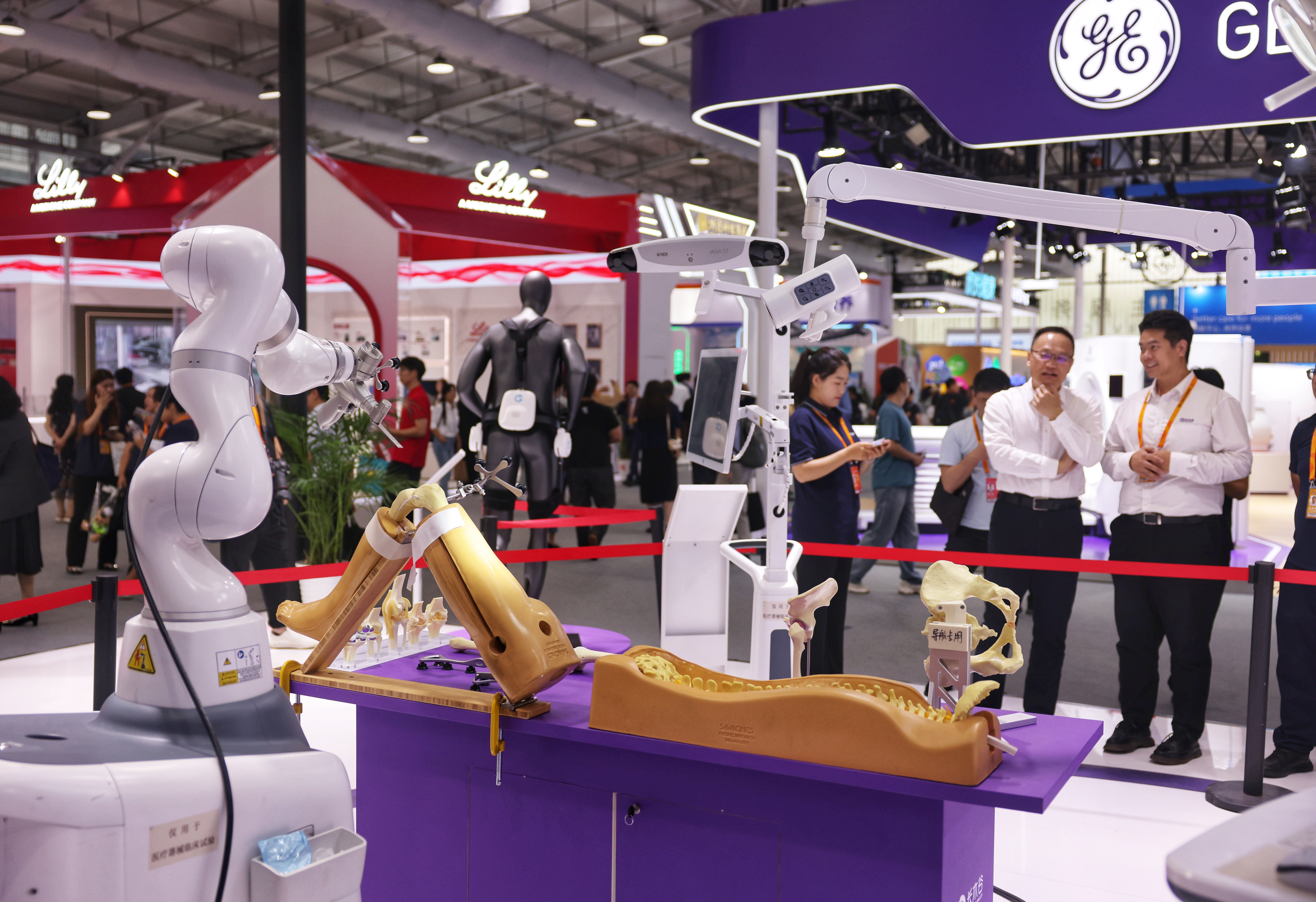 北京经开区众多高精尖企业集体亮相服贸会,观众参观一款全景化展示数智骨科手术室。新京报记者 李木易 摄