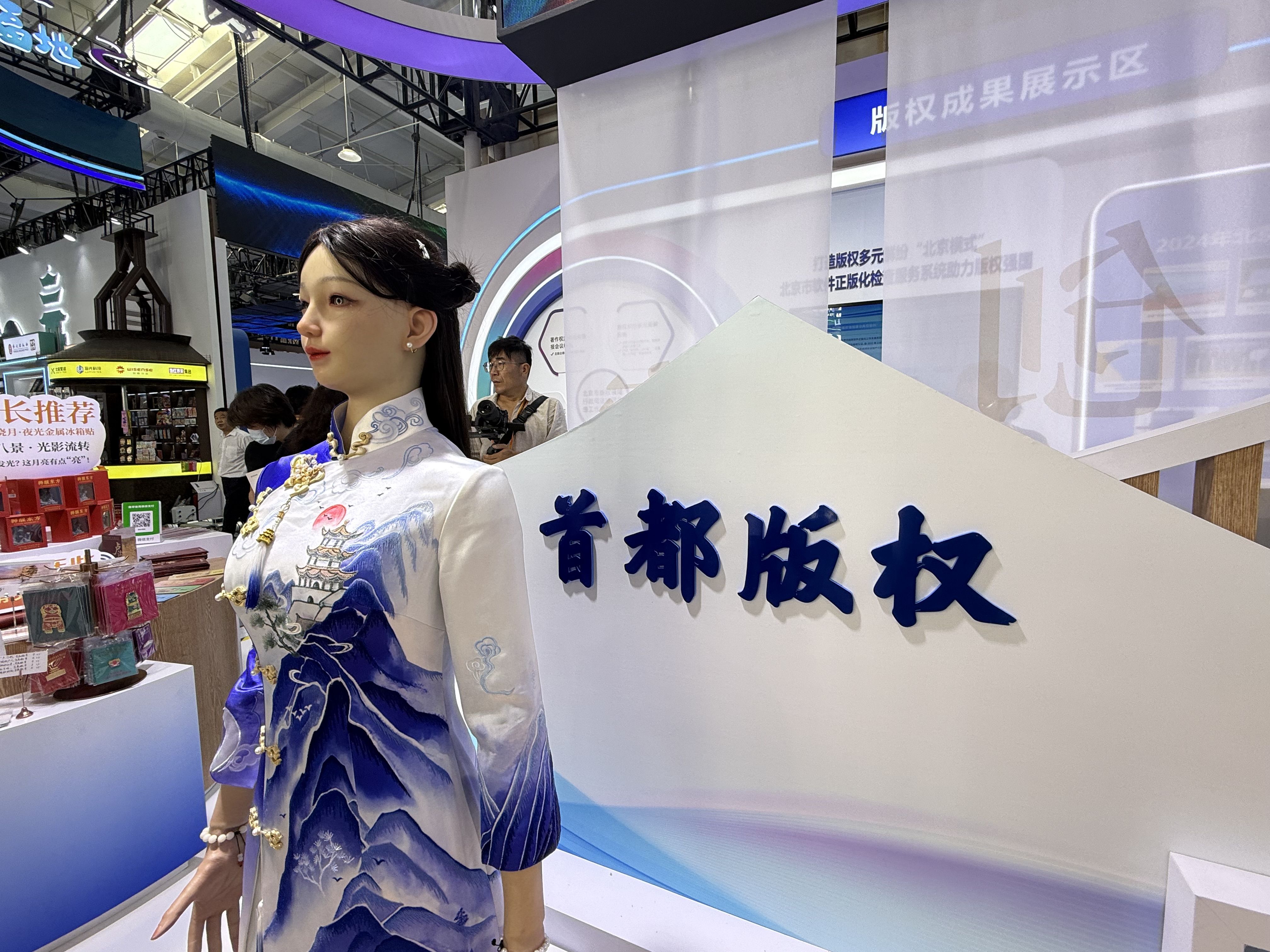 在今年服贸会的9号馆,一个身着新中式服装的机器人“版版”吸引不少观众上前打卡。她站在馆内的首都版权展区,观众当面问她“什么是版权?”她会立马科普一次版权知识。