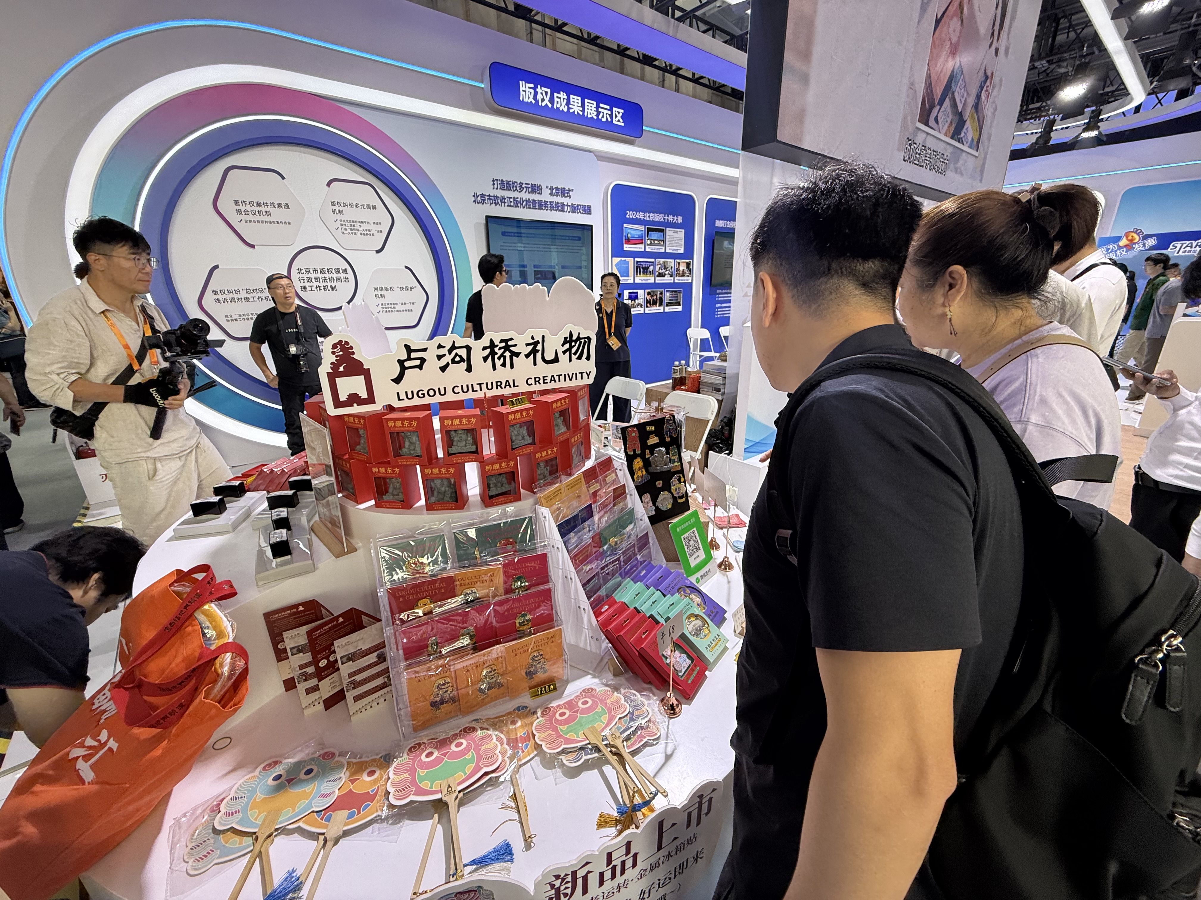 今年首都版权展区展示的内容“很有料”。记者在现场看到,展区以“版权+IP”为核心,设置版权成果展示区、数字文博展示区、文创IP共生空间、舞台活动区、“我为版权发声”打卡区5大展区,突出“文化传统”与“数字创新”两大内涵。