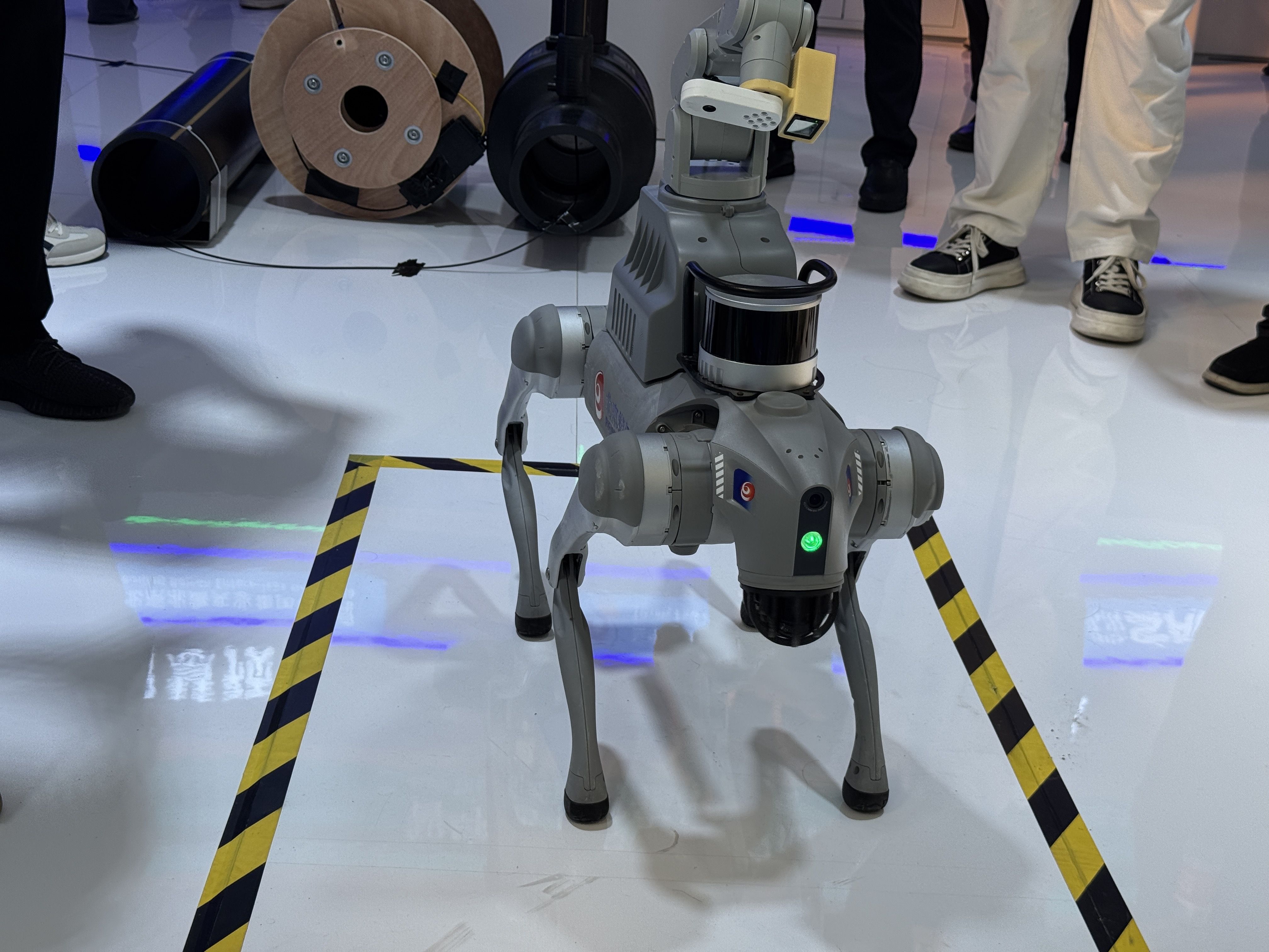 “这是专门为社区燃气巡检场景量身定制的机器狗,可深入社区稳定执行安全巡检任务,”在管线感知板块,现场工作人员正介绍“巡检精灵”,“带着它沿小区、沿着日常训练路线走一遍,它就会把路线记住,可以实现对居民区燃气管道沿线的动态检测。”在检测到小区燃气引入口时,“巡检精灵”的机械臂仰角支架会自动抬升,通过激光甲烷遥测仪精准扫描引入口,确保引入口处的燃气安全。