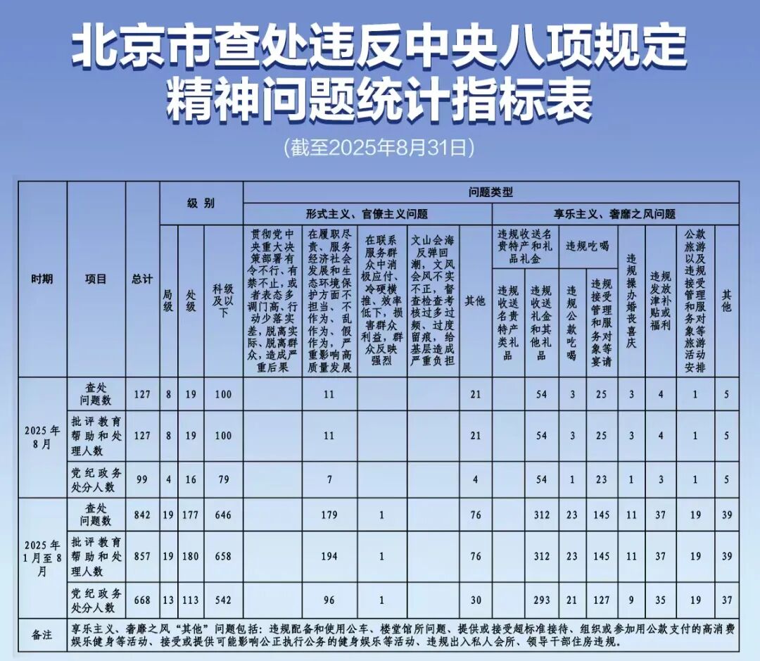 新京报讯 据清风北京消息,日前,北京市纪委监委公布今年1月至8月查处违反中央八项规定精神问题统计指标表。截至8月31日,累计查处违反中央八项规定精神问题842起,批评教育帮助和处理857人,其中局级19人、处级180人、科级及以下658人。