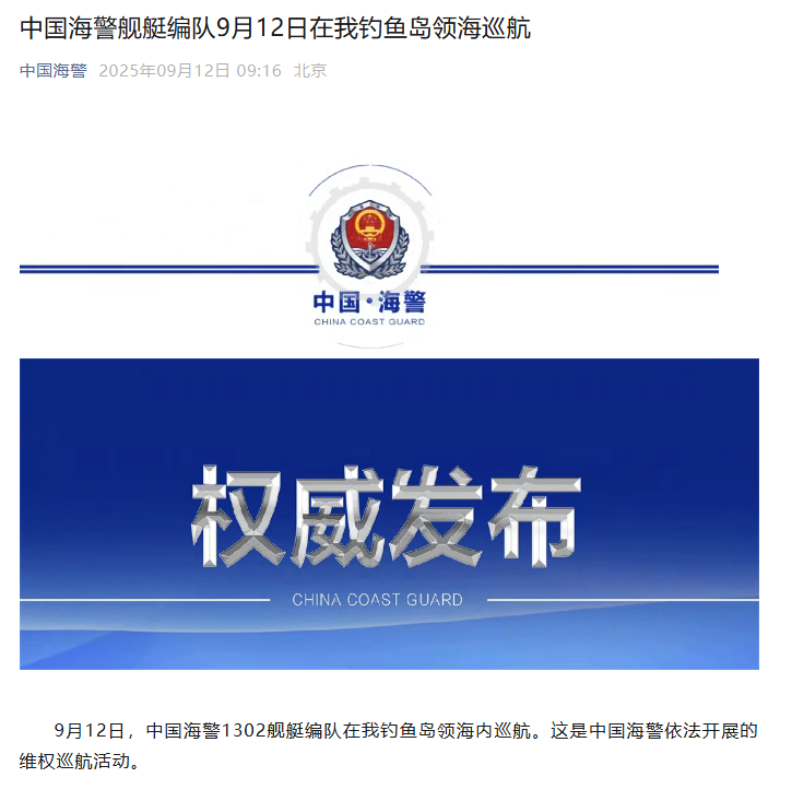 新京报讯 据中国海警微信公众号消息,9月12日,中国海警1302舰艇编队在我钓鱼岛领海内巡航。这是中国海警依法开展的维权巡航活动。