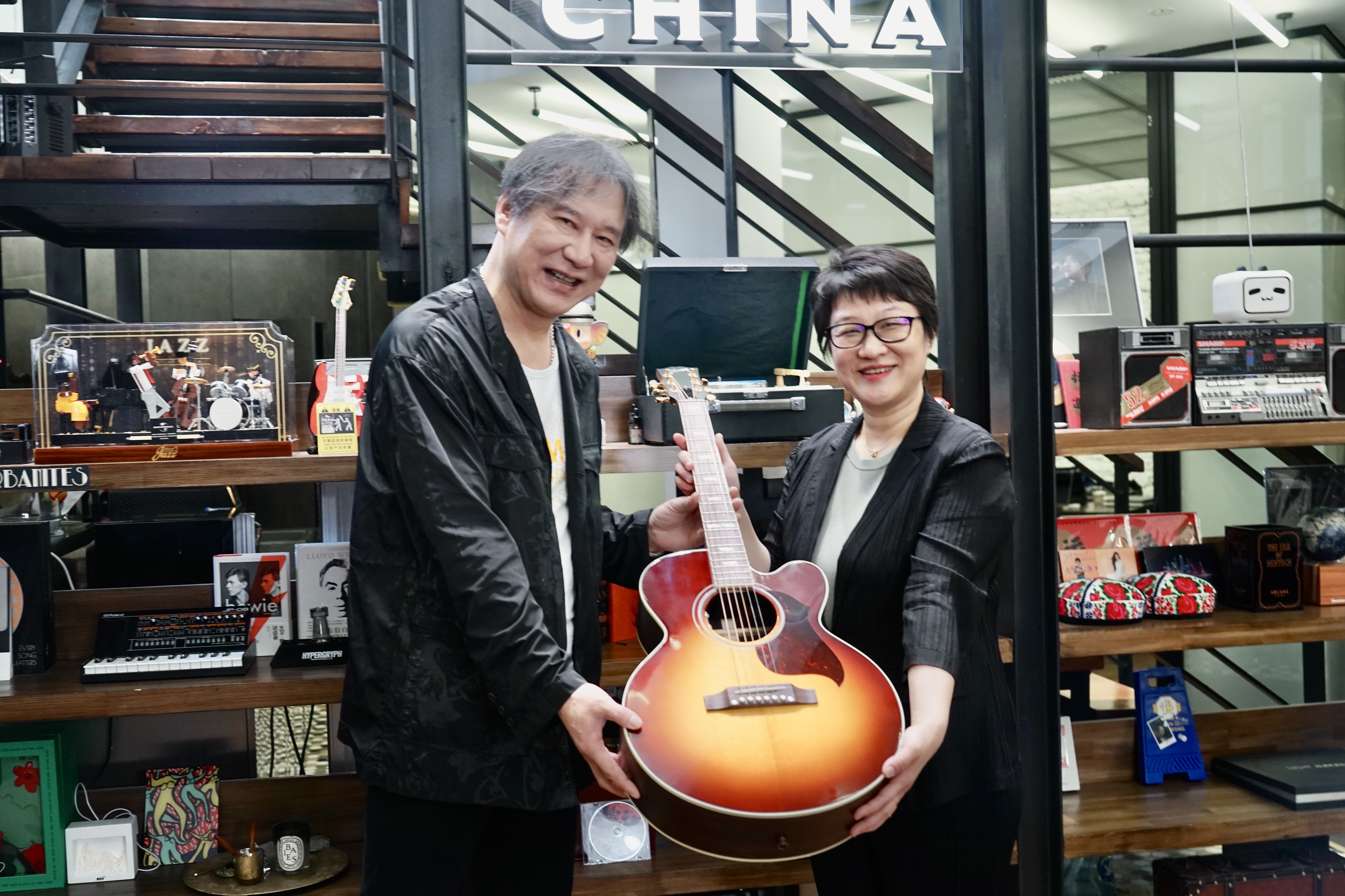 环球音乐版权管理集团中国公司董事总经理孙嘉谣(右)向马条赠送了一把Gibson吉他。