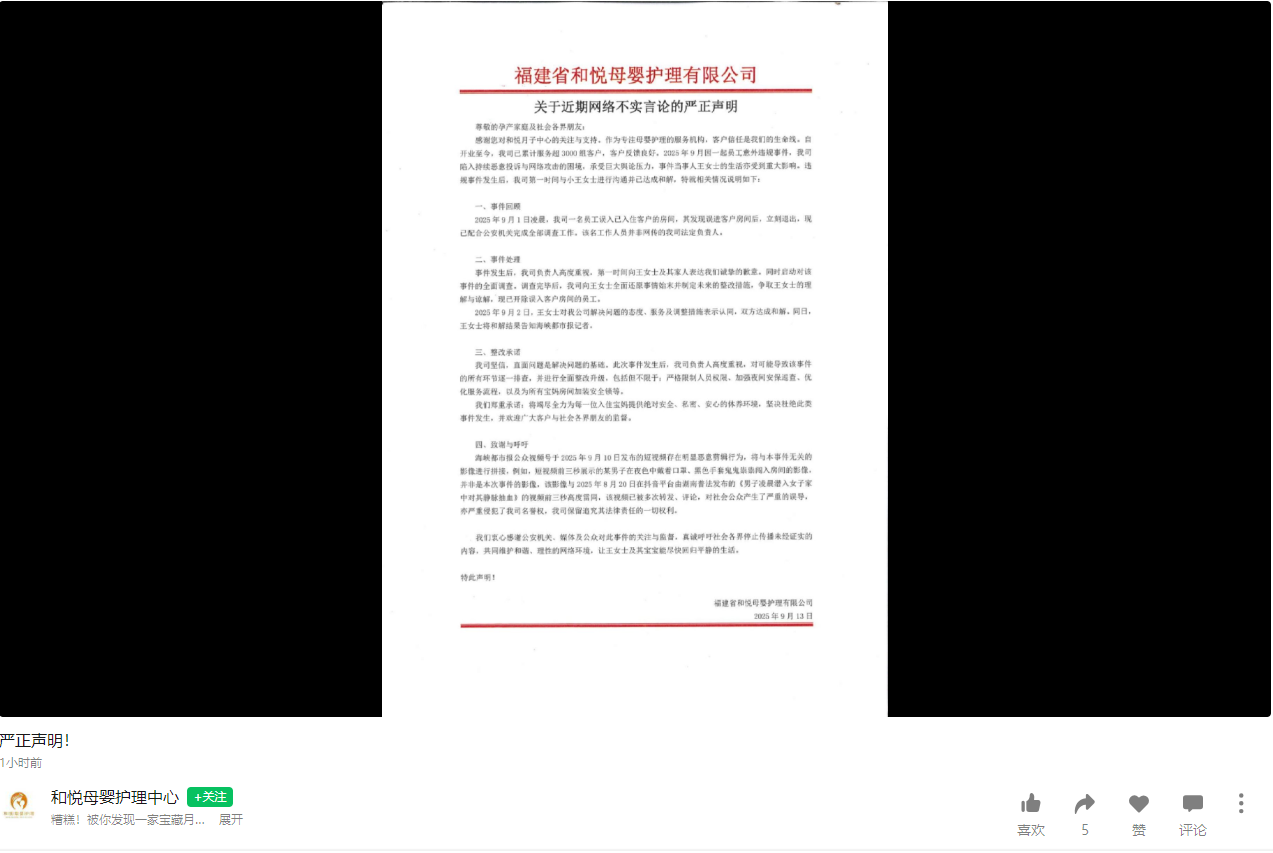 新京报讯 9月13日,福建和悦母婴护理中心发布声明。全文如下: