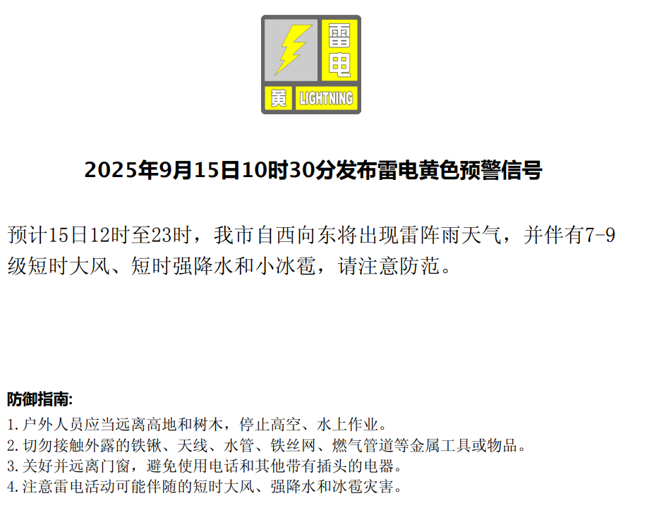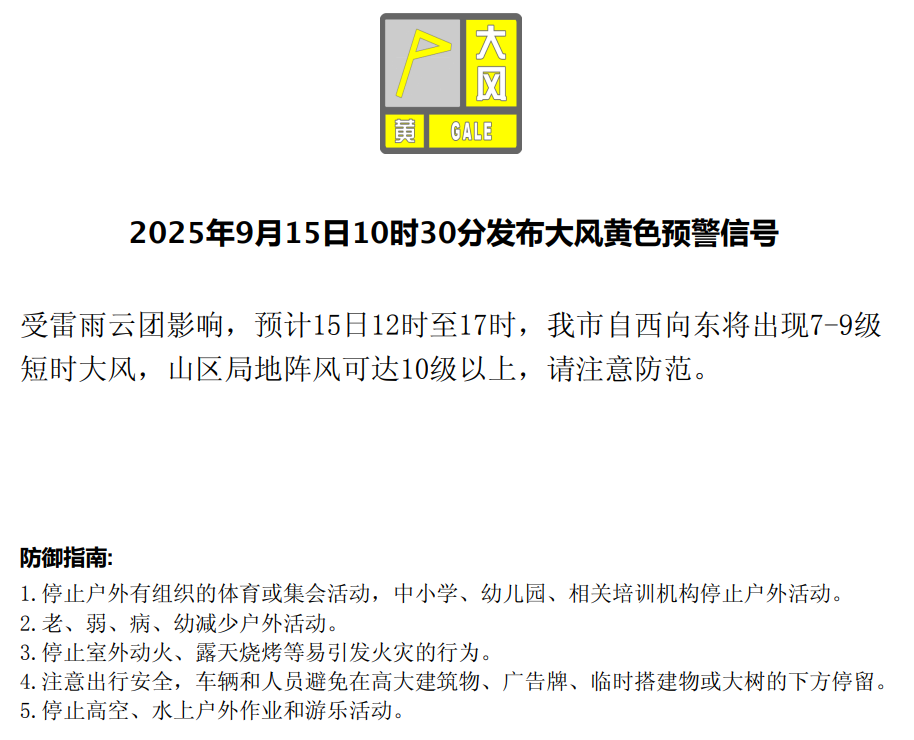 预警信息显示,受雷雨云团影响,预计9月15日12时至17时,北京自西向东将出现7-9级短时大风,山区局地阵风可达10级以上,请注意防范。